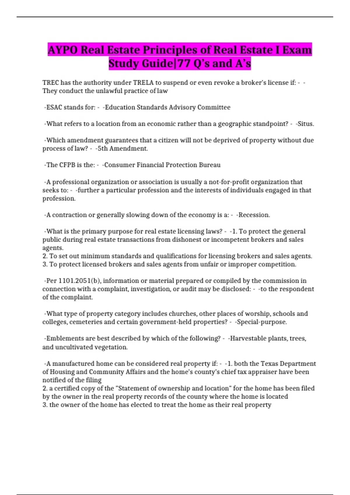 AYPO Real Estate Principles of Real Estate I Exam Study Guide|77 Q’s and A’s