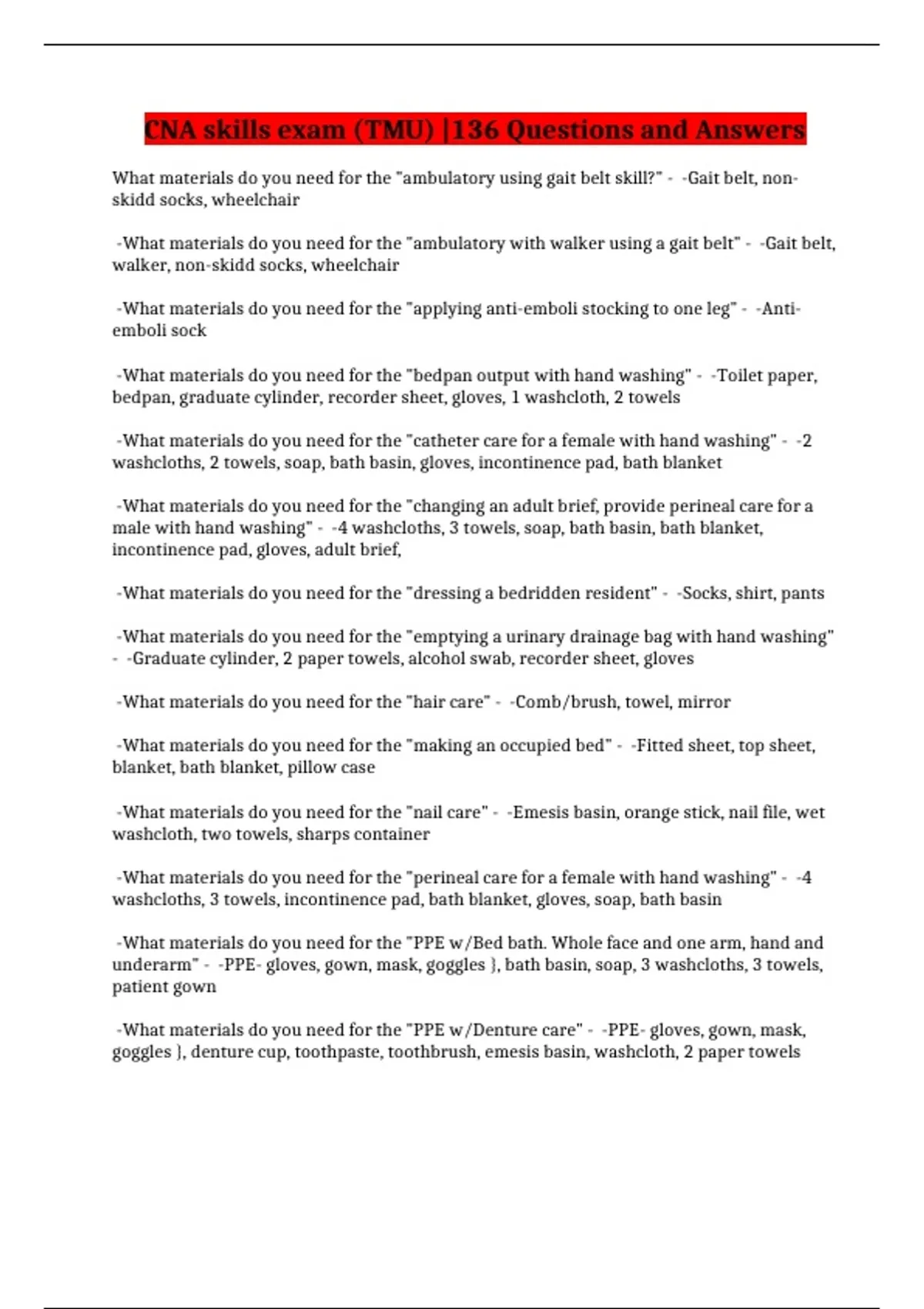 CNA skills exam (TMU) |136 Questions and Answers