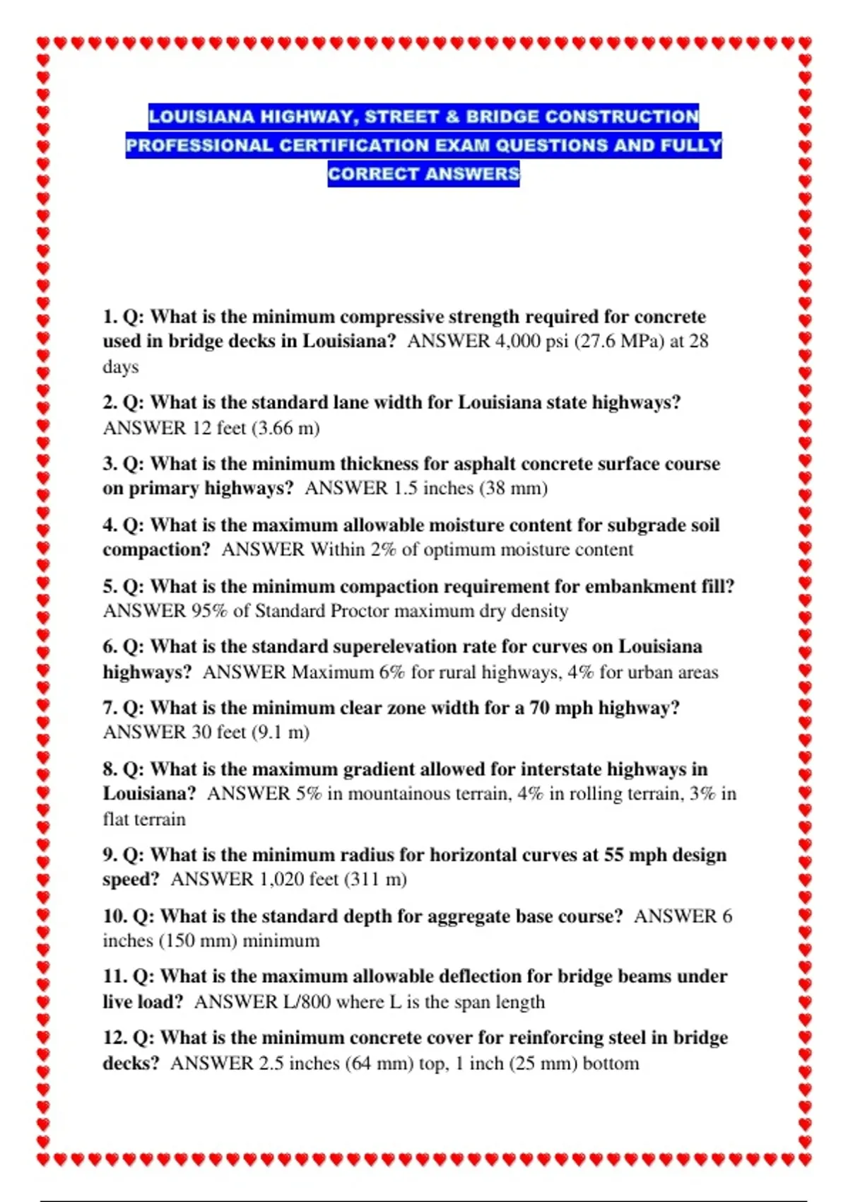 LOUISIANA (LA) HIGHWAY, STREET & BRIDGE CONSTRUCTION PROFESSIONAL CERTIFICATION EXAM QUESTIONS AND FULLY CORRECT ANSWERS