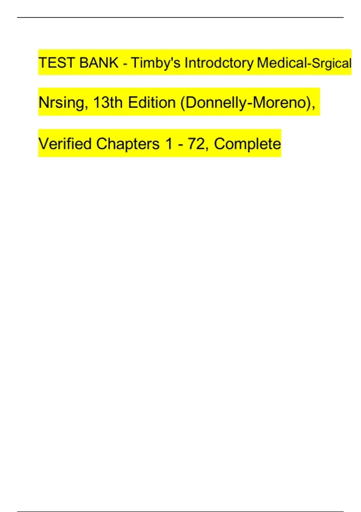 TEST BANK - TIMBY'S INTRODCTORY MEDICAL-SRGICAL NRSING, 13TH EDITION (DONNELLY-MORENO), VERIFIED CHAPTERS 1 - 72, COMPLETE