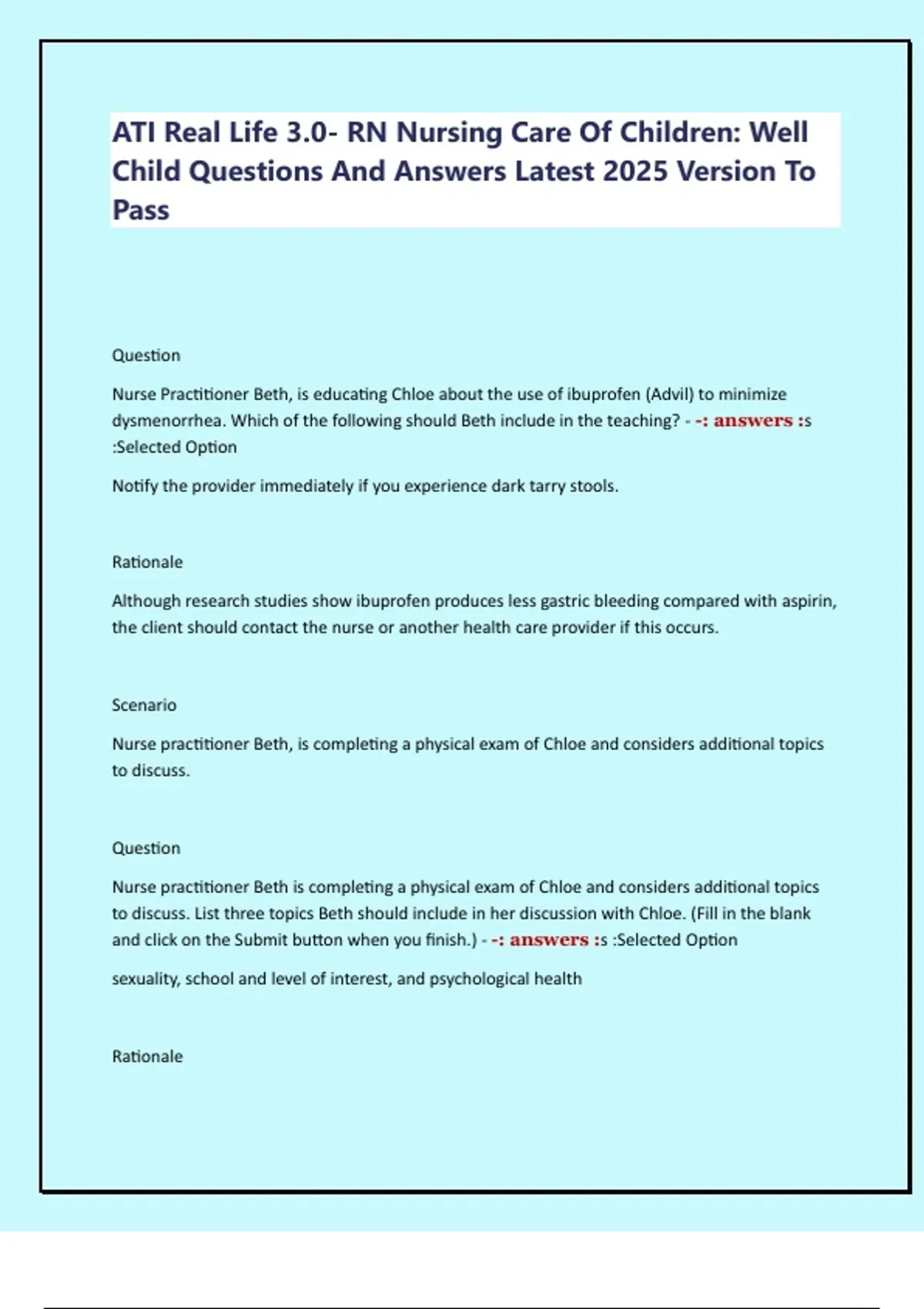 ATI Real Life 3.0- RN Nursing Care Of Children: Well Child Questions And Answers Latest 2025 Version To Pass