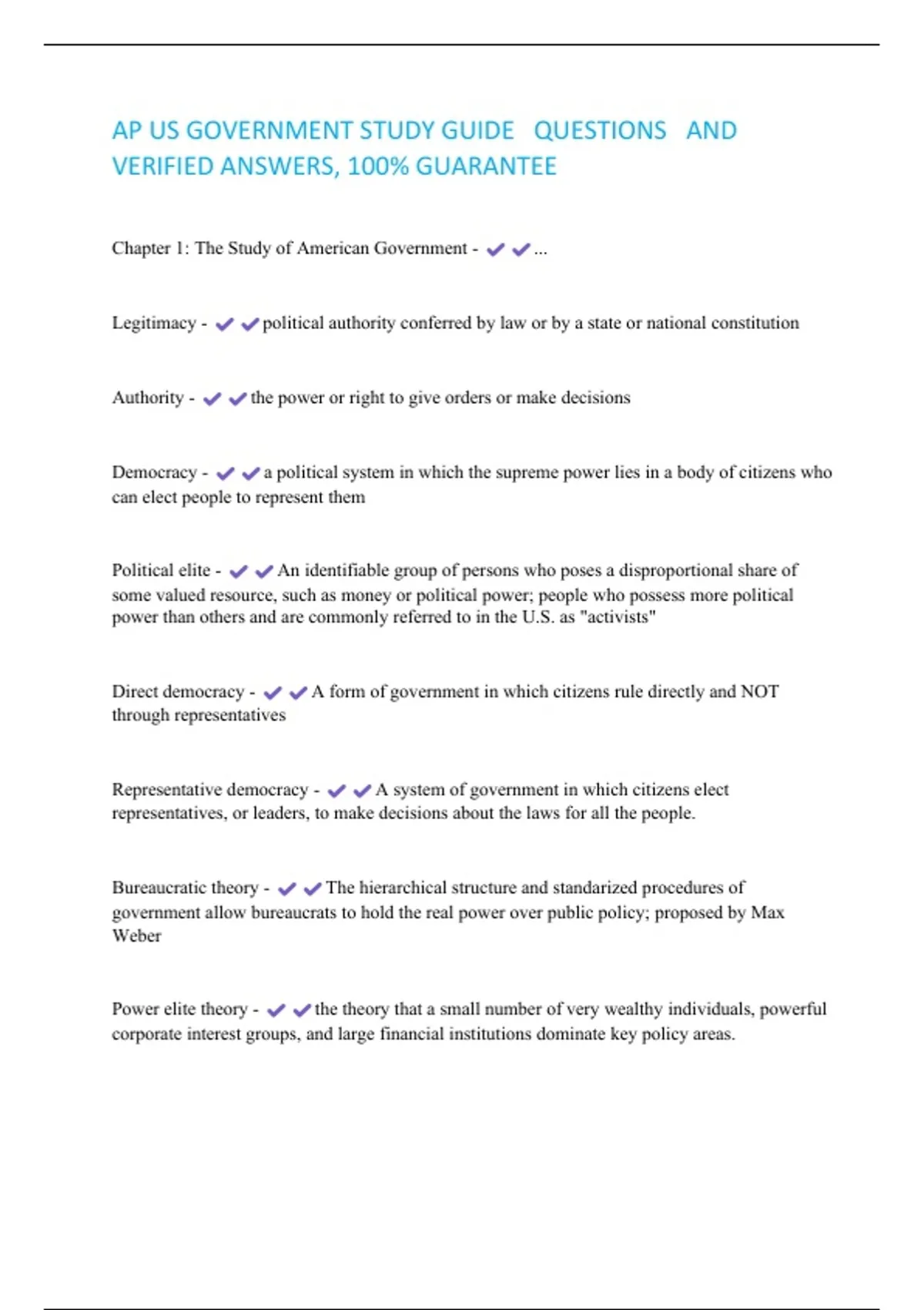 AP US GOVERNMENT STUDY GUIDE QUESTIONS AND VERIFIED ANSWERS
