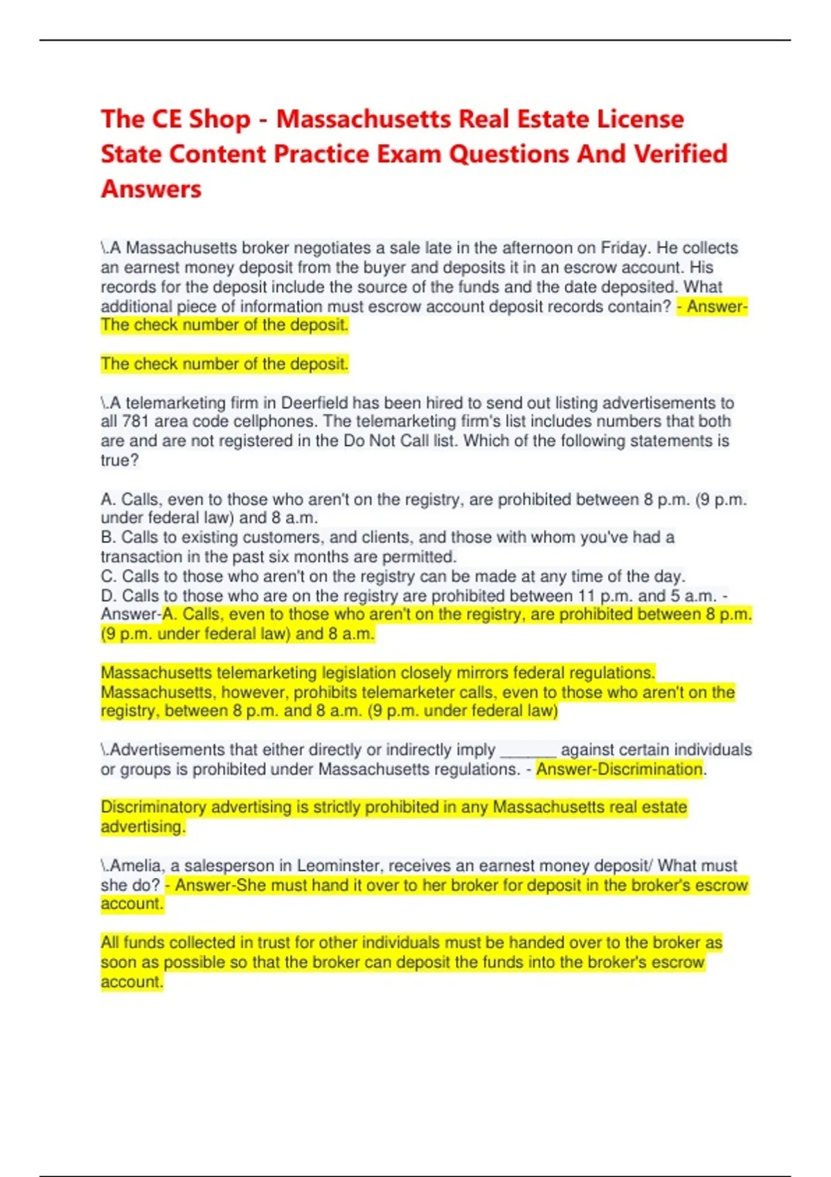 MASSACHUSETTS REAL ESTATE LICENCE EXAMS COMPLETE QUESTIONS AND VERIFIED ANSWERS