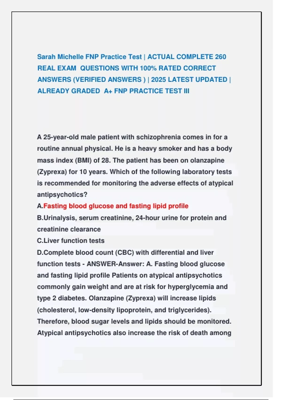 Sarah Michelle FNP Practice Test | ACTUAL COMPLETE 40 REAL EXAM QUESTIONS WITH 100% RATED CORRECT ANSWERS Sarah Michelle FNP Practice Test | Nurse Sarah Oncology Practice test Sarah Michelle FNP Practice Test | ACTUAL COMPLETE 75 REAL EXAM QUESTIONS WITH 100% RATED CORRECT ANSWERS Sarah Michelle FNP Practice Test