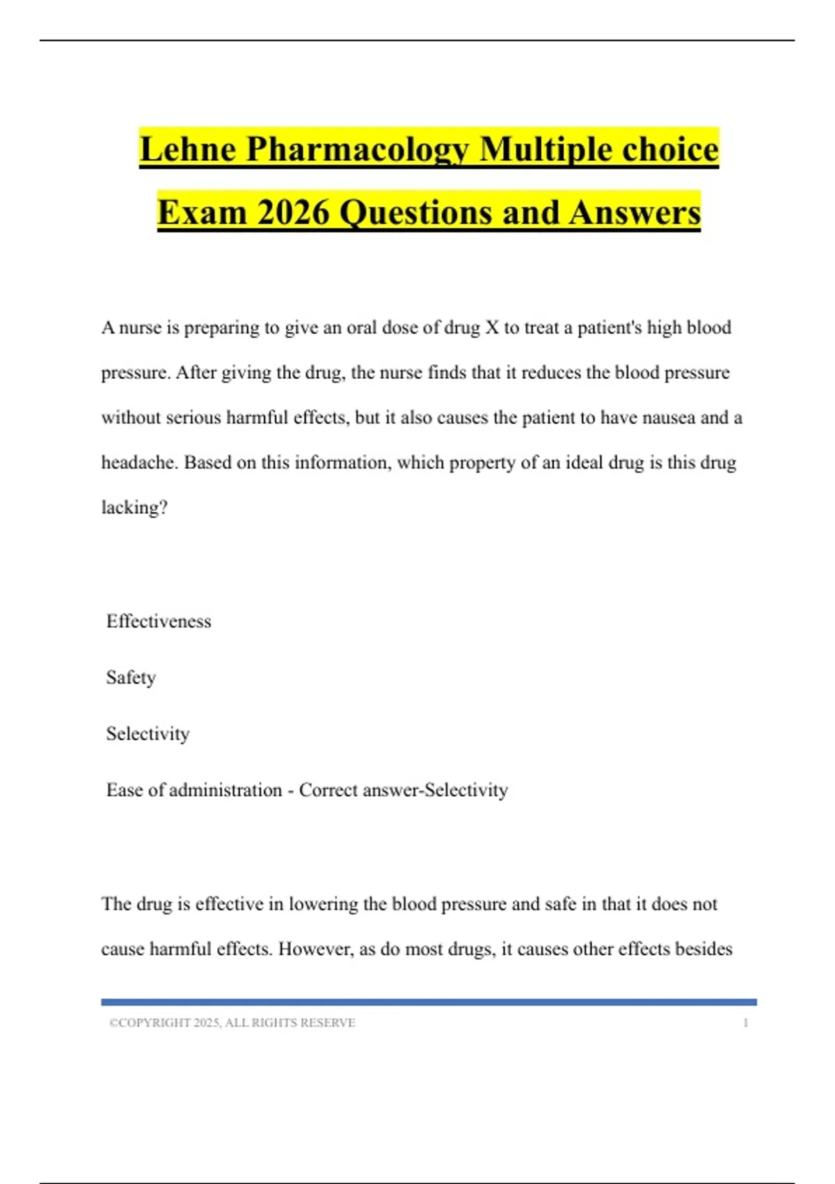 Lehne Pharmacology Multiple choice Exam 2026 Questions and Answers
