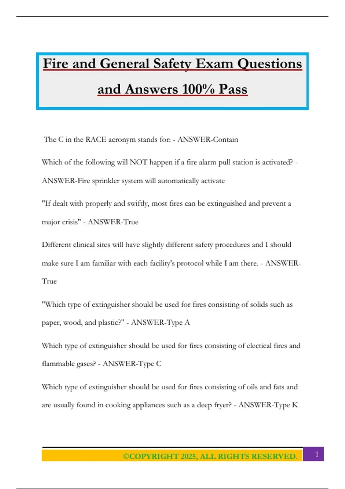 Fire and General Safety Exam Questions and Answers 100% Pass