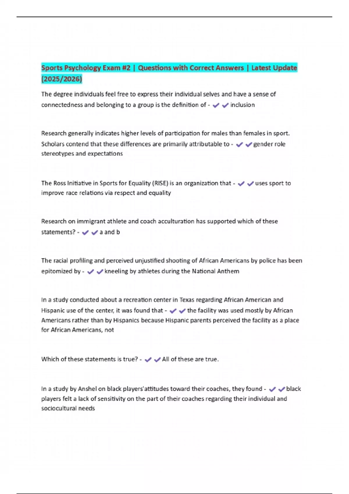 Sports Psychology Exam #2 | Questions with Correct Answers | Latest Update (2025/2026)