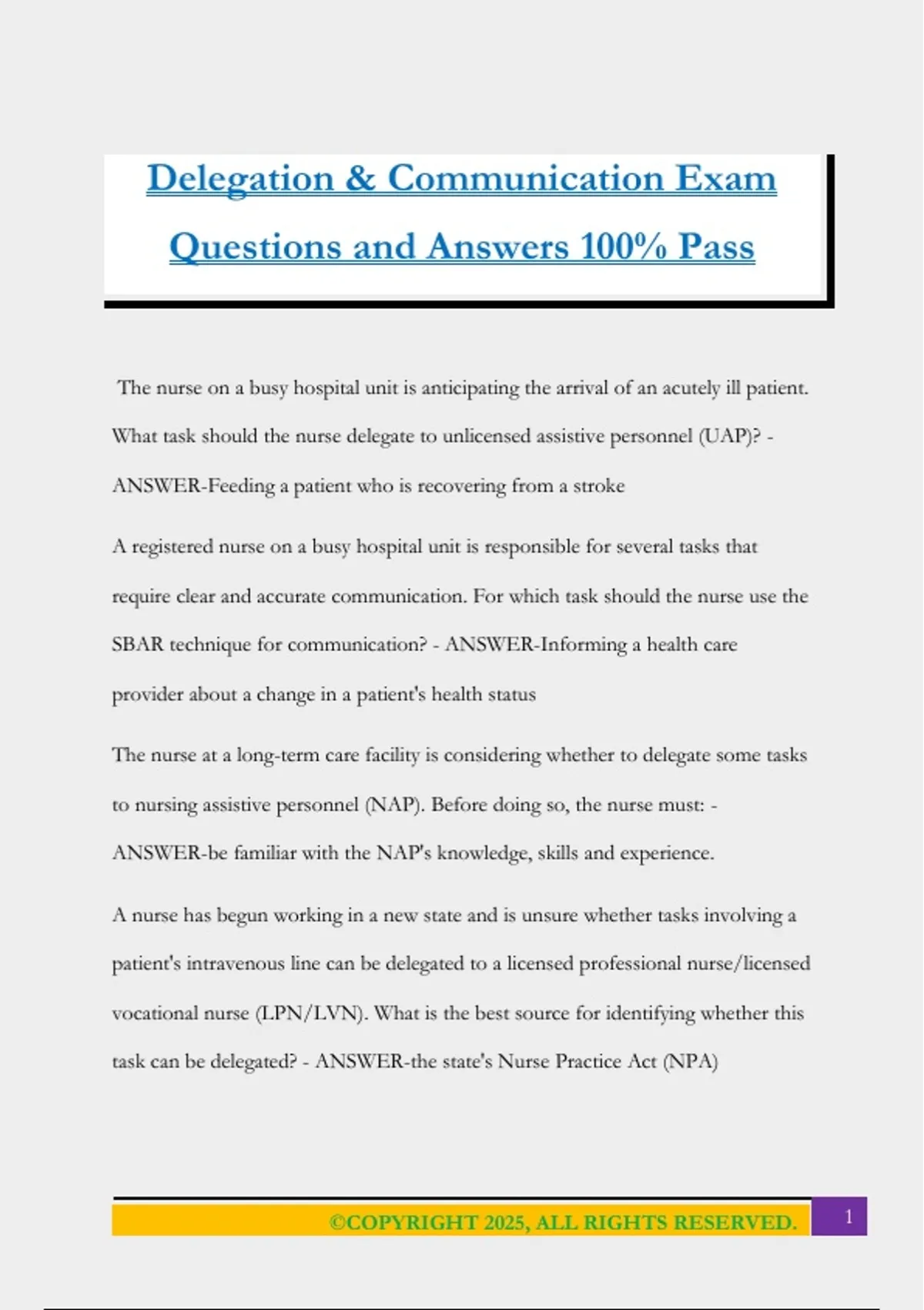 Delegation Test -- NURSING LEADERSHIP Exam Questions and Answers 100% Pass