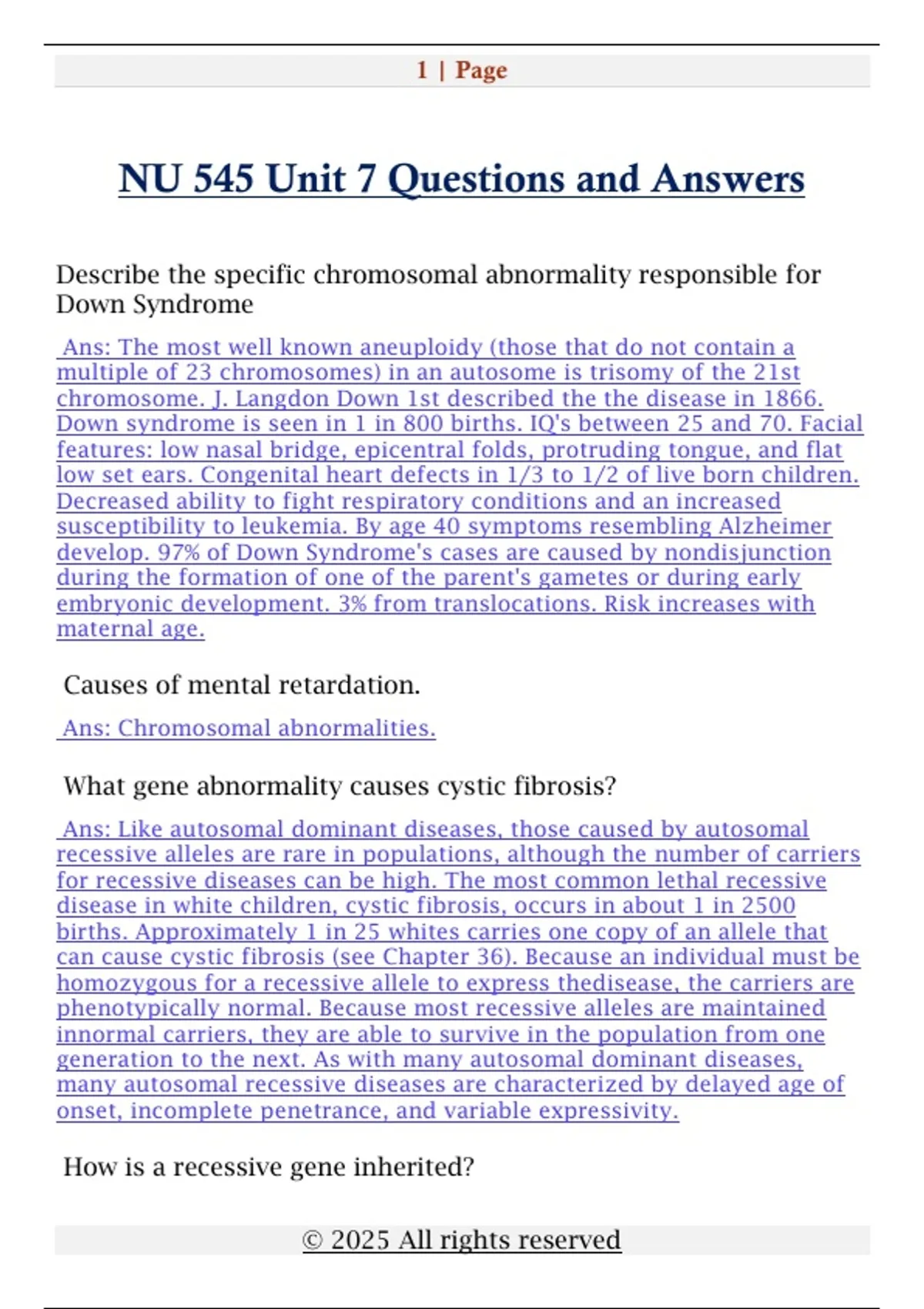 Pathophysiology NU 545 Questions and Answers Pathophysiology NU 545 Questions and Answers