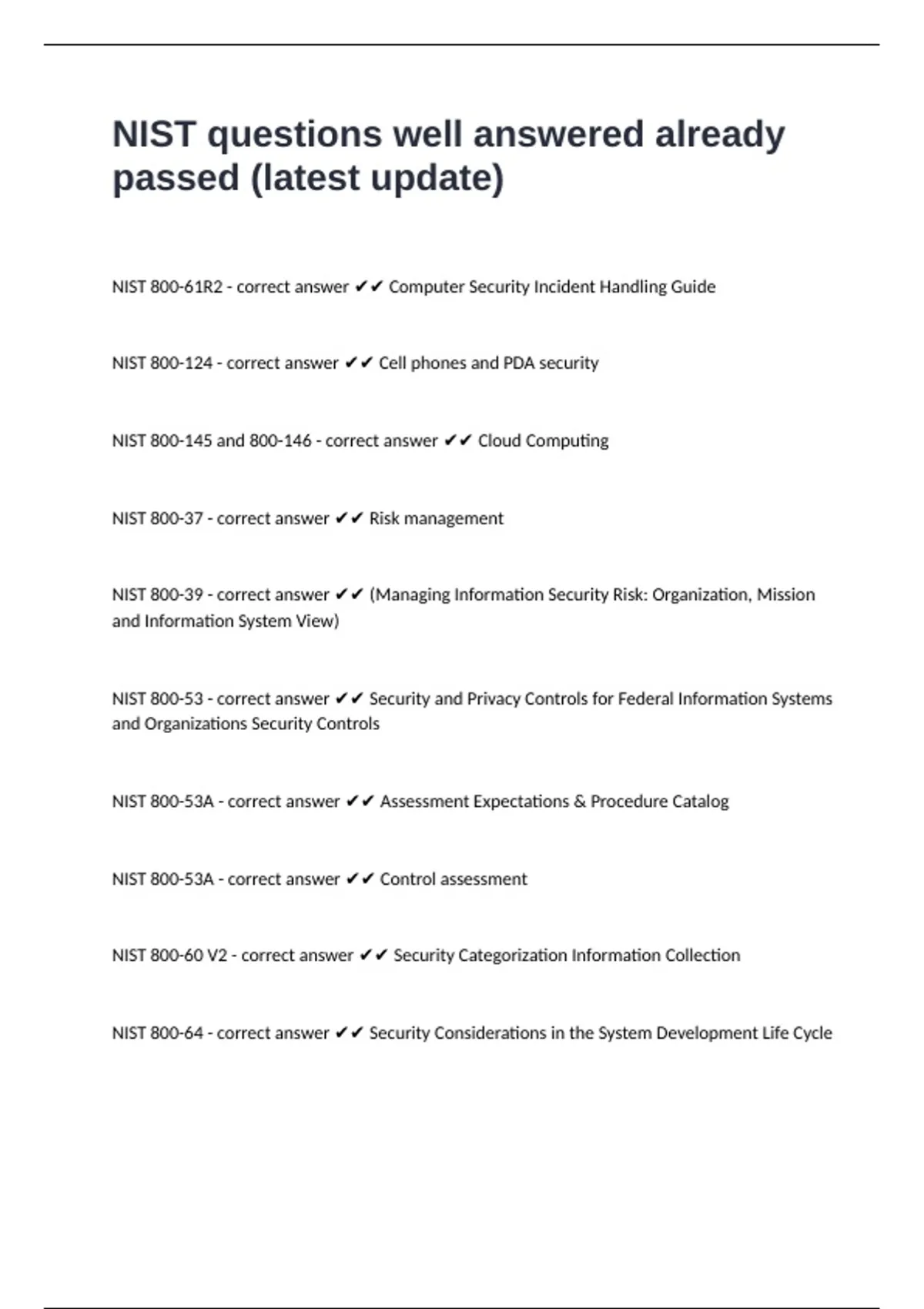 1 Exam (elaborations) Quiz Chapter 12 (NIST) questions and answers graded A+ 2 Exam (elaborations) NIST Test 4 questions and verified answers 3 Exam (elaborations) NIST Standards well solved already passed 4 Exam (elaborations) Nist practice questions and answers rated A+