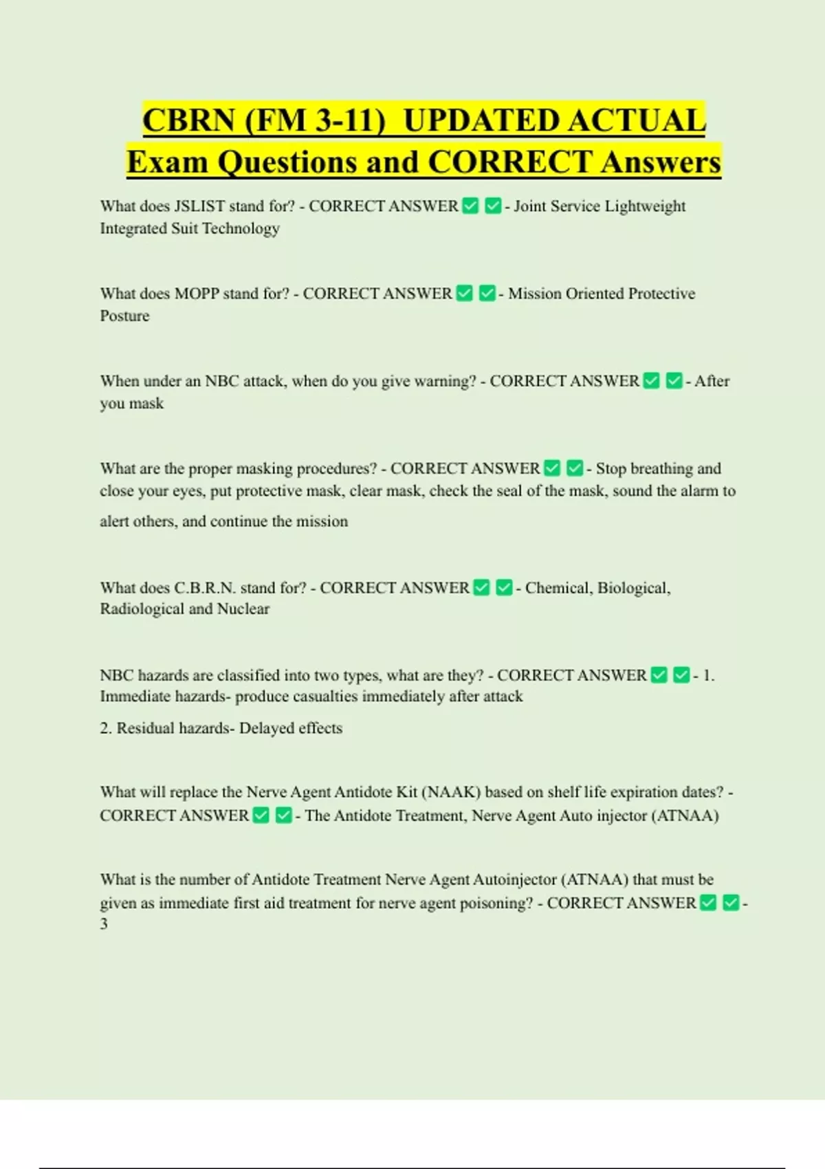 CBRN Test UPDATED Exam Questions and CORRECT Answers