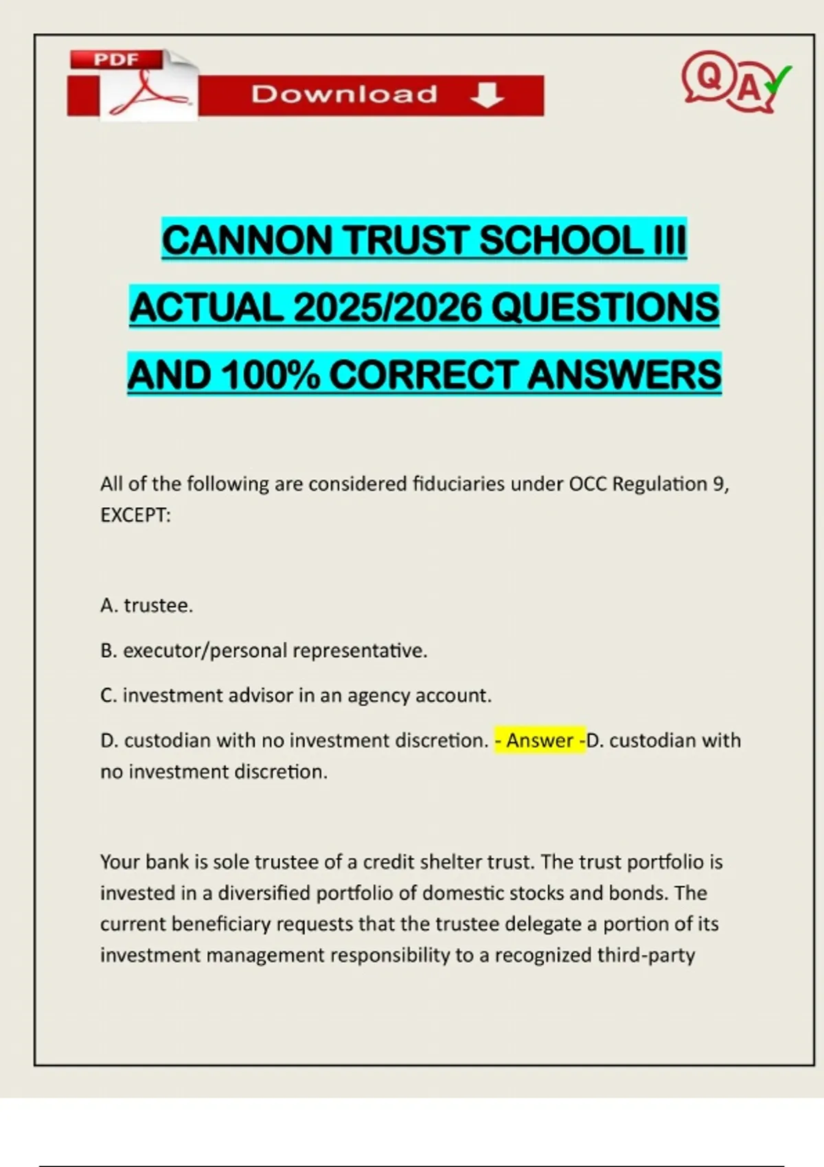 PACKAGE DEAL:: CANNON TRUST SCHOOL I, II, III EXAMS ACTUAL 2025/2026 Q&A 100% PASS