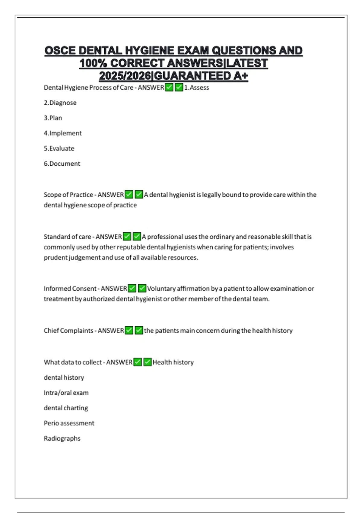 OSCE DENTAL HYGIENE EXAM QUESTIONS AND 100% CORRECT ANSWERS|LATEST 2025/2026|GUARANTEED A+