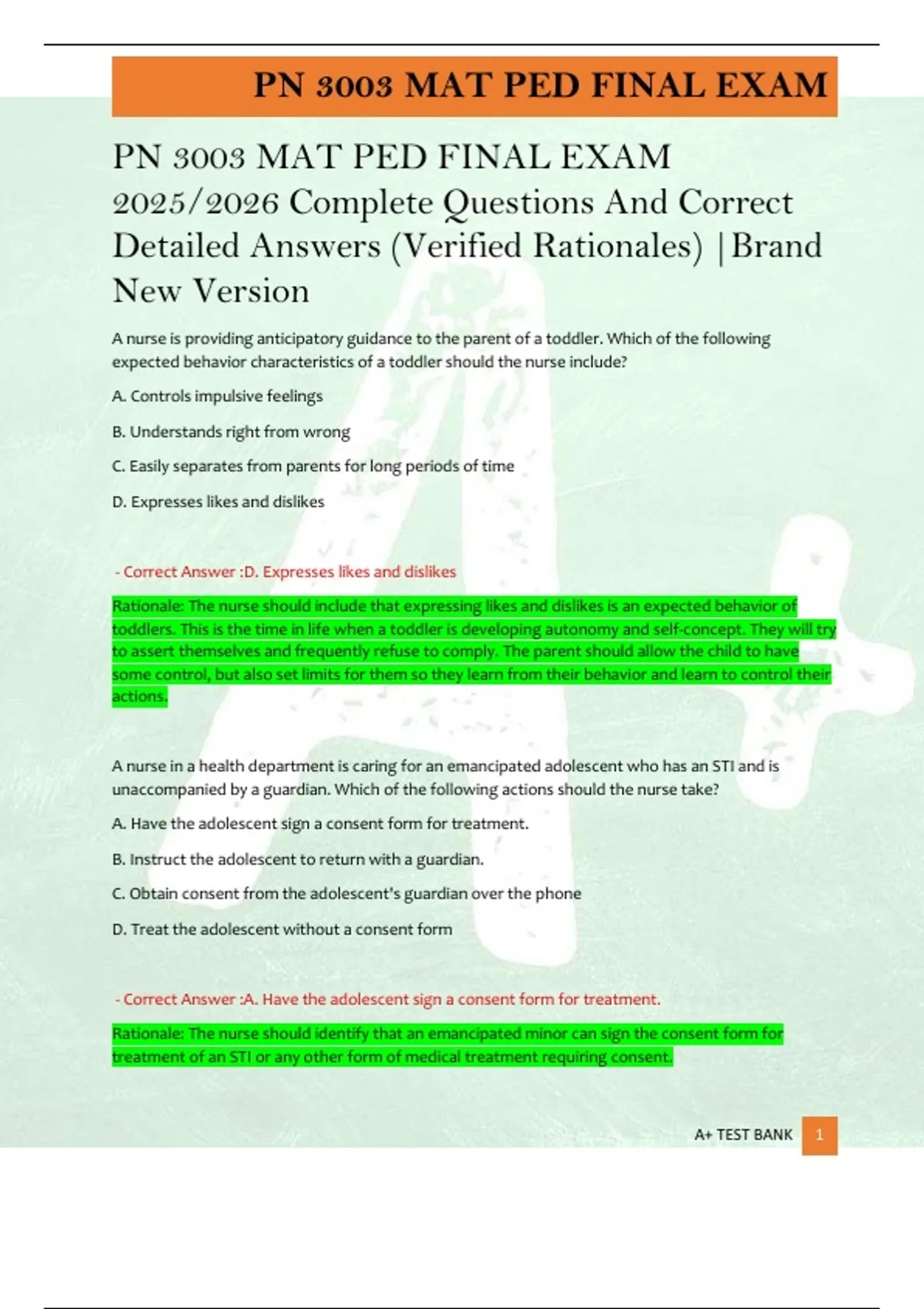 PN 3003 MAT PED FINAL EXAM test bank 2025/2026 Complete Questions And Correct Detailed Answers (Verified Rationales) |Brand New Version
