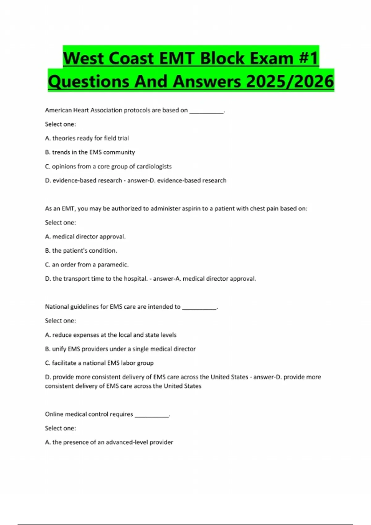 Package deal For West Coast EMT Block Exam Questions and Answers | verified | updated | 2025/2026