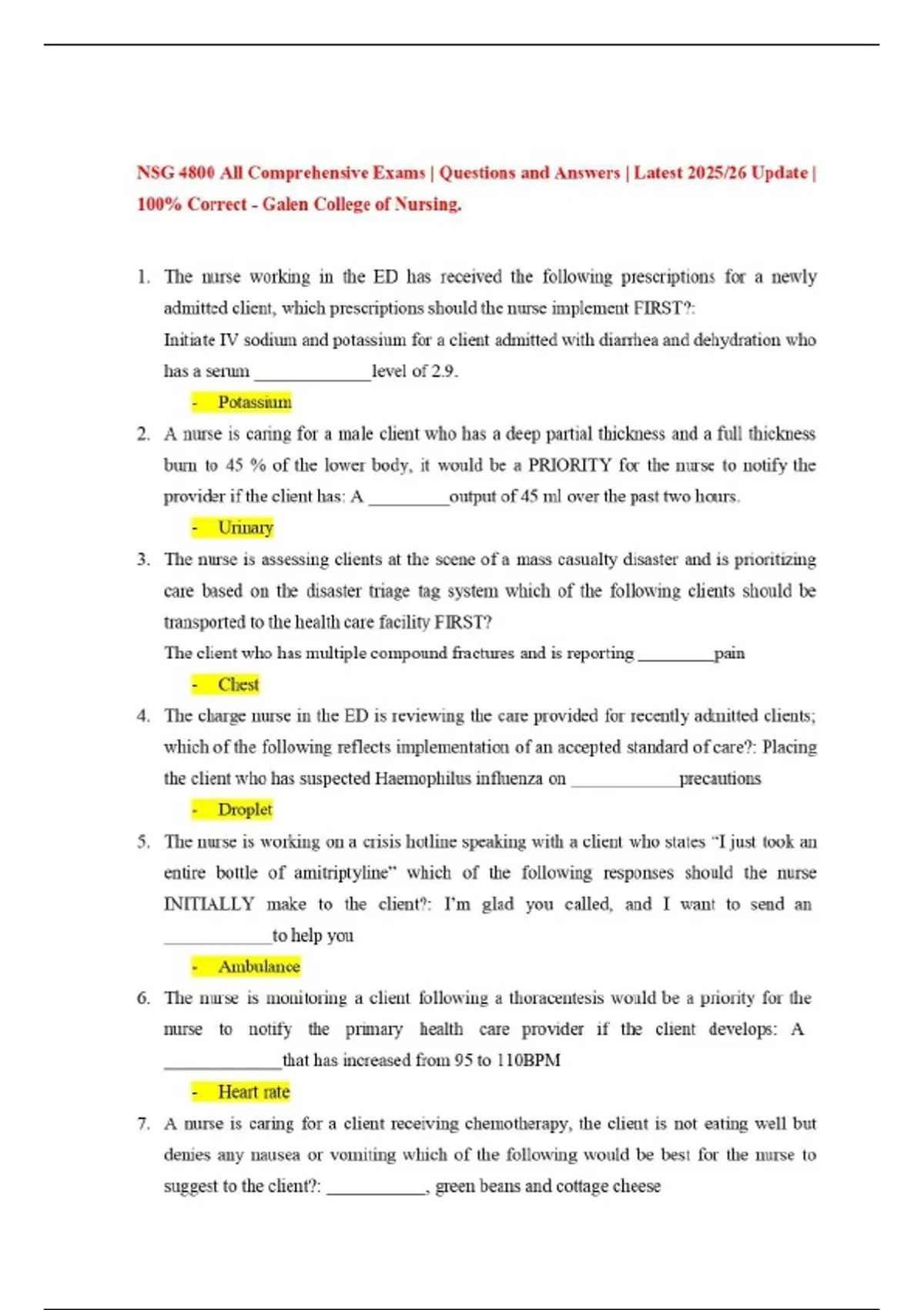 NSG 4800 Exam Questions with no Answers | 2025/26 Update. NSG 4100 Comp Exam 2 Review | Questions and Answers | 2025/2026 Update | 100% Accurate - Galen College of Nursing NSG 4800 Comp Exams Review | 2025/2026 Updates with complete solutions- Galen College of Nursing. NSG 4800 Highest Priority Exam NSG 4800 All Comprehensive Exams