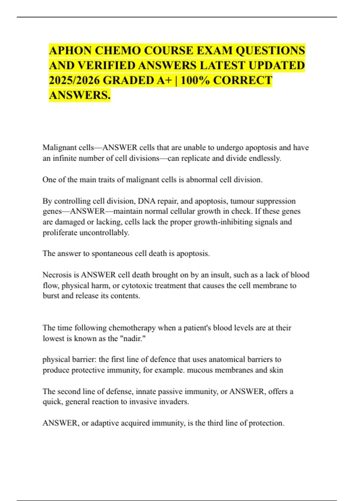 APHON Certification Practice Exam Questions with Answers and Rationales Updated 2026 | APHON CHEMO COURSE EXAM QUESTIONS AND VERIFIED ANSWERS | APHON Principles of Chemo and Biotherapy Exam PRACTICE QUESTIONS AND CORRECT ANSWERS | CPHON AND APHON EXAM LATEST VERSION & APHON OVERVIEW EXAM QUESTIONS AND VERIFIED ANSWERS LATEST 2026 GRADED A |