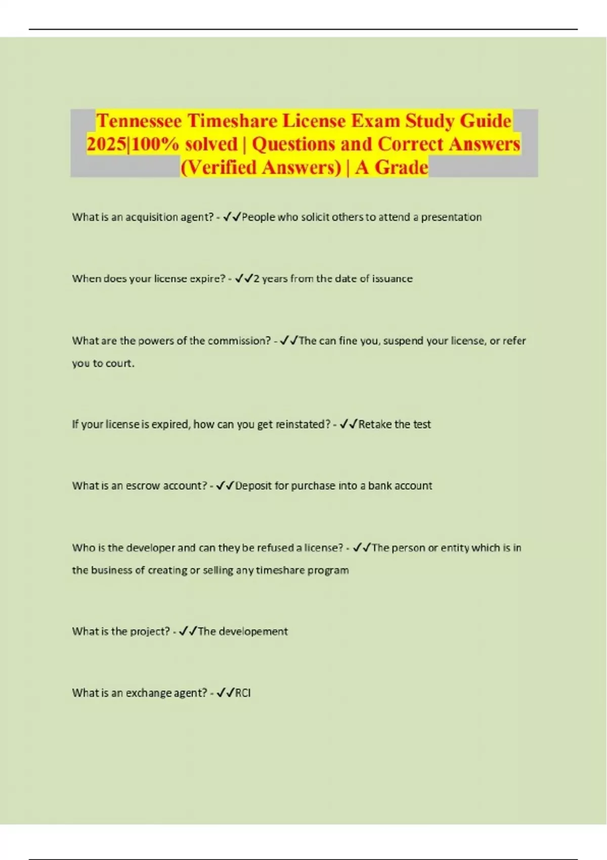 Tennessee Timeshare License Exam Study Guide2025|100% solved | Questions and Correct Answers (Verified Answers) | A Grade