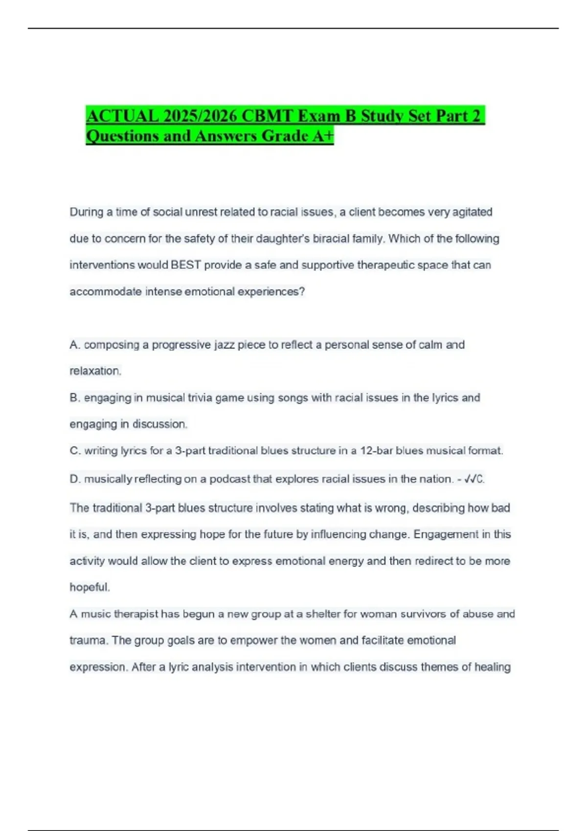 ACTUAL 2025/2026 CBMT Exam Music Therapy Boards-Questions and Answers Grade A+