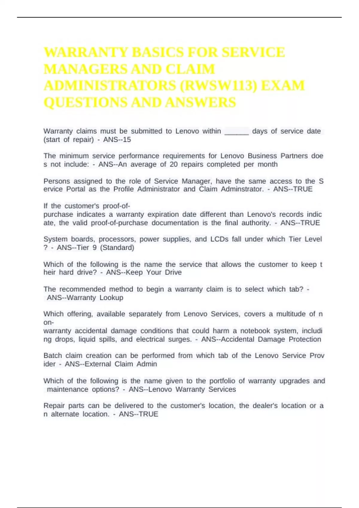WARRANTY BASICS FOR SERVICE MANAGERS AND CLAIM ADMINISTRATORS (RWSW113) EXAM QUESTIONS AND ANSWERS