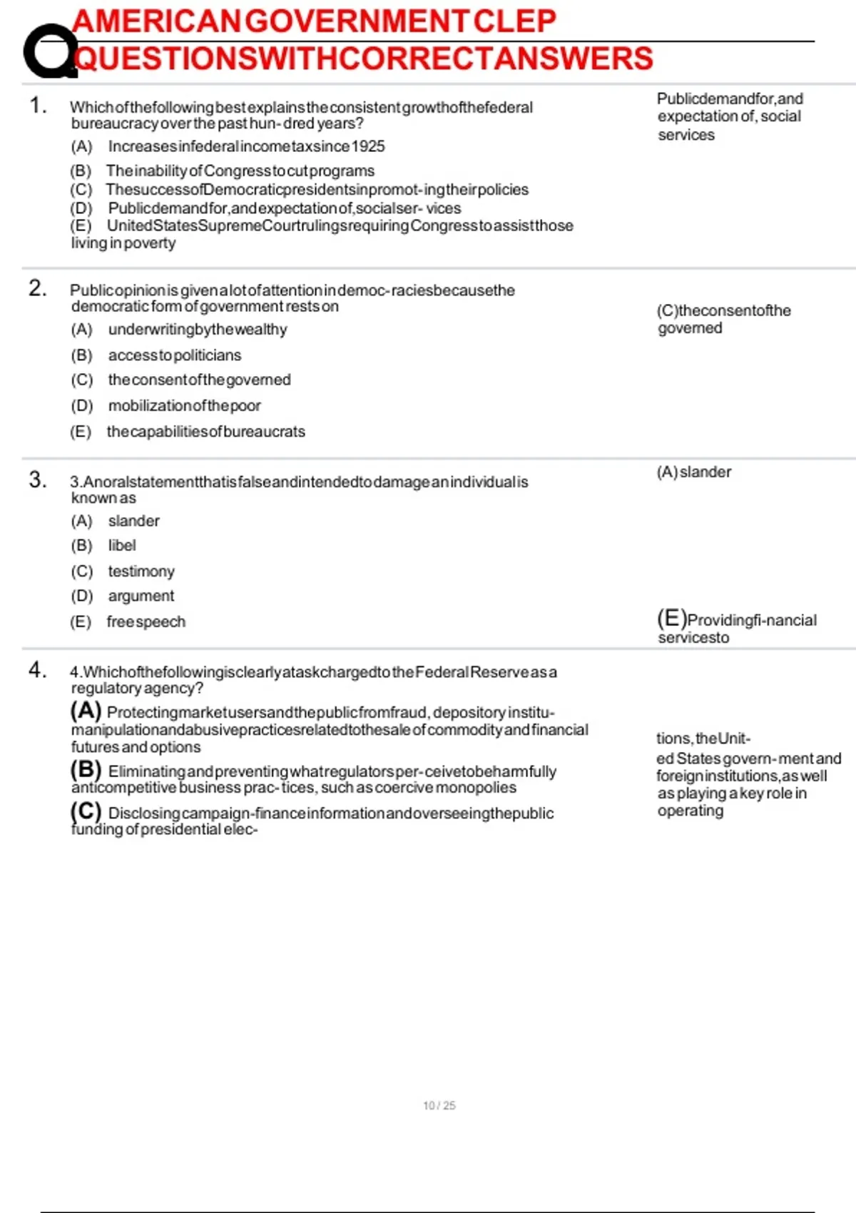 Exam (elaborations) AMERICAN GOVERNMENT CLEP QUESTIONS WITH CORRECT ANSWERS 2 Exam (elaborations) AMERICAN GOVERNMENT COMPREHENSIVE EXAM PREP QUESTIONS WITH CORRECT ANSWERS 2025/2026 NEW!! 100% VERIFIED CORRECT