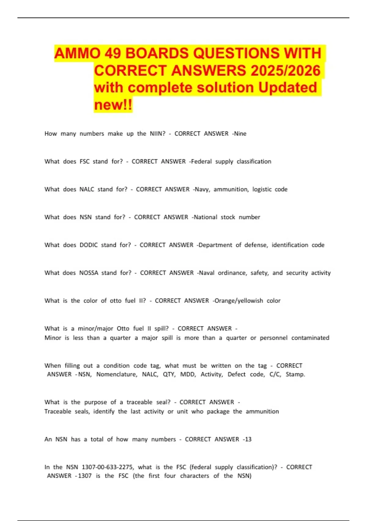 Exam (elaborations) AMMO 49 BOARDS QUESTIONS WITH CORRECT ANSWERS 2025/2026 with complete solution Updated new!! 2 Exam (elaborations) AMMO 49 QUESTIONS WITH CORRECT ANSWERS 2025/2026 with complete solution New!! 3 Exam (elaborations) AMMO 49 STUDY GUIDE QUESTIONS WITH CORRECT ANSWERS 2025/2026 updated new!! 4 Exam (elaborations) AMMO 49&18 NKO