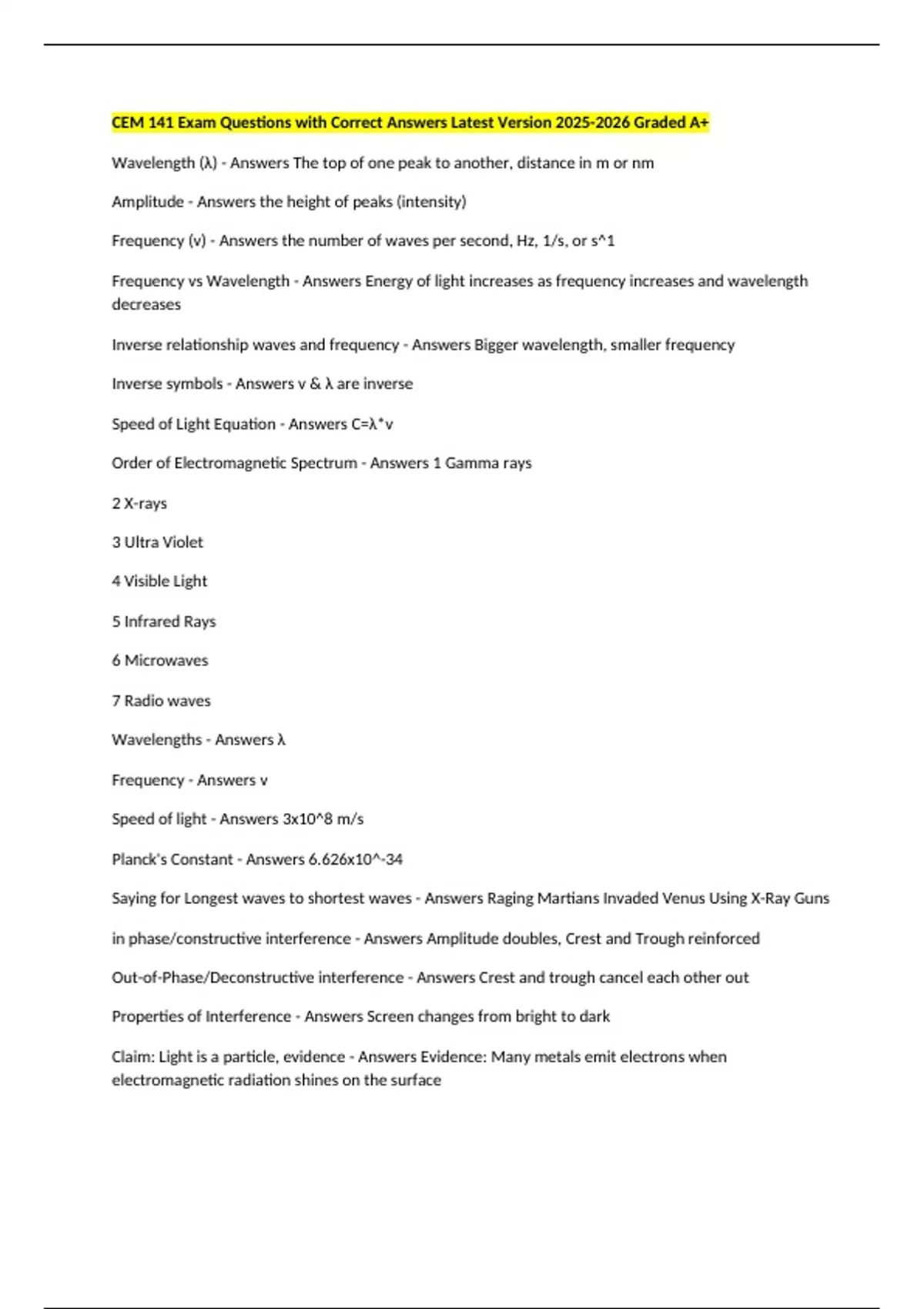 CEM 141 Exam Questions with Correct Answers Latest Version Graded A+