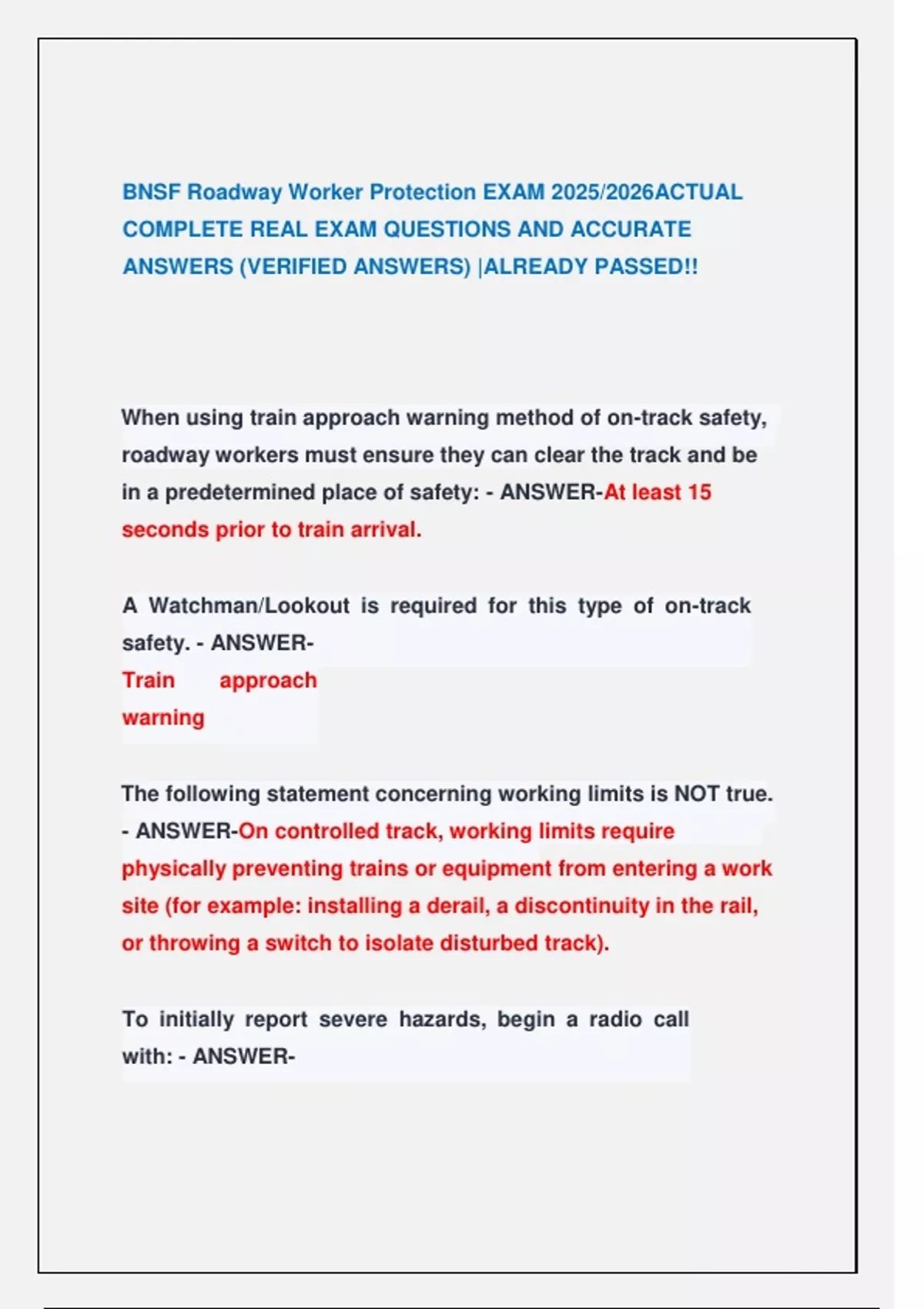 BNSF Roadway Worker Protection EXAM 2025/2026ACTUAL COMPLETE REAL EXAM QUESTIONS AND ACCURATE ANSWERS (VERIFIED ANSWERS) |ALREADY PASSED!! BNSF Roadway Worker Protection Exam 2025/2026 Actual Comprehensive Real Exam Questiions And Correct Answers (Verified Answers) Already Graded A+ | Newest Exam | Just Released!!