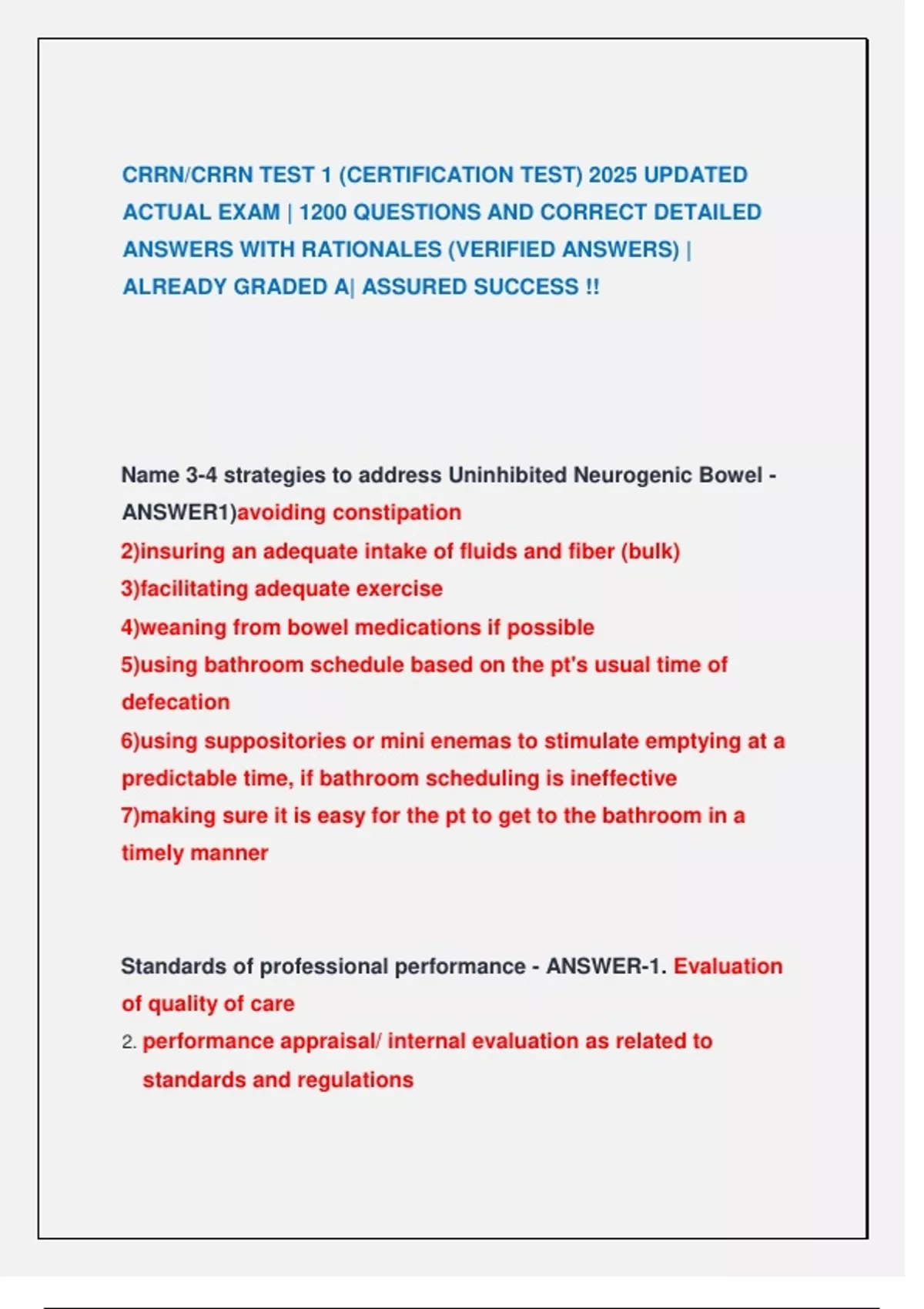 CRRN TEST 1 (CERTIFICATION TEST) ACTUAL COMPLETE 300 REAL EXAM QUESTIONS AND CORRECT DETAILED ANSWERS CRRN TEST 1 (CERTIFICATION TEST) ACTUAL EXAM 175 QUESTIONS AND CORRECT DETAILED ANSWERS WITH RATIONALES CRRN TEST 1 EXAM ACTUAL COMPLETE REAL EXAM QUESTIONS AND CORRECT ANSWERS CRRN/CRRN TEST 1 (CERTIFICATION TEST) 2025