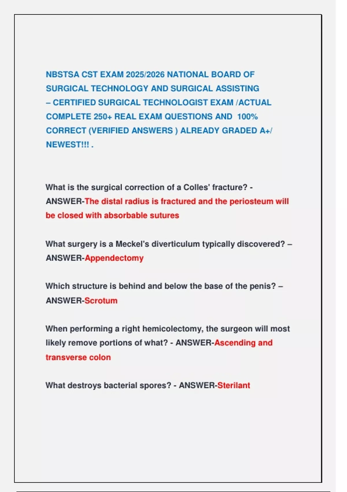 NBSTSA CST Practice Exam A 2025/2026 ACTUAL COMPLETE REAL EXAM QUESTIONS NBSTSA CST Practice Exam B 2025/2026 ACTUAL COMPLETE REAL EXAM QUESTIONS AND CORRECT ANSWERS NBSTSA CST EXAM AND PRACTICE EXAM 2025/2026 NBSTSA CST EXAM 2025/2026 CST - NBSTSA Exam Actual Complete Real Exam Questions & Correct Answers (Verified Answers) | Get It