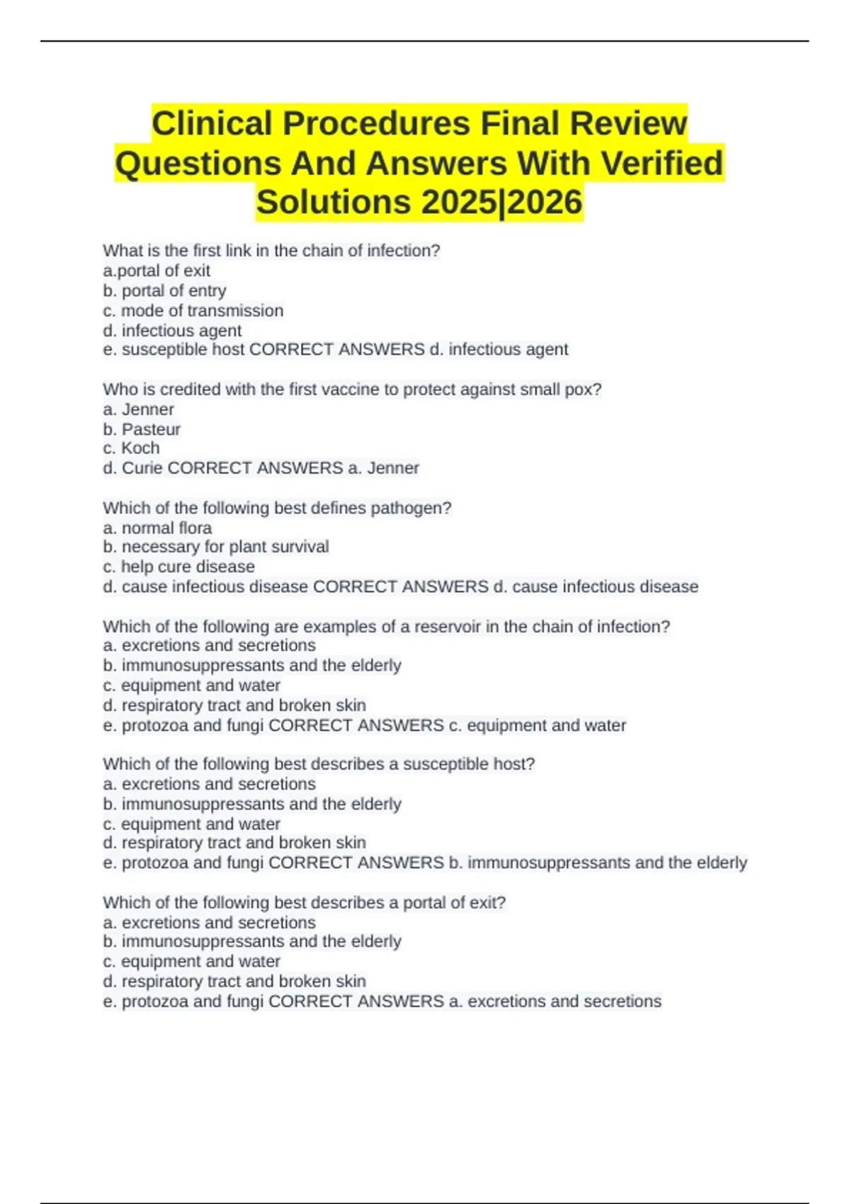 Clinical Procedure 1 Final Exam Questions With All Correct Answers 2025|2026 Latest Update!! Clinical Procedures Exam 1 Questions With 100% Correct Answers | Verified 302 Final Review ( clinical procedures ) Solved Correctly To Score A+