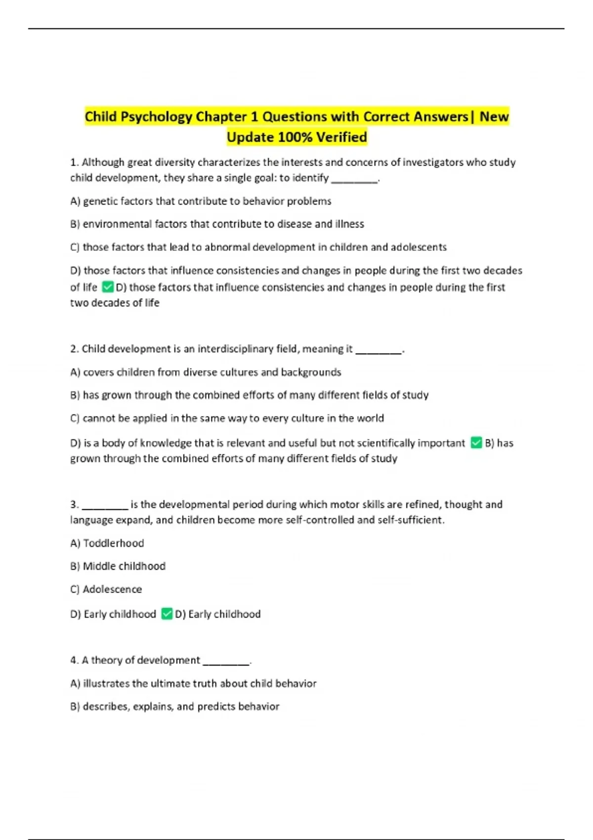 Child Psychology Chapter 1 Questions with Correct Answers| New Update 100% Verified 2 Exam (elaborations) Child Psychology Exam Questions with Correct Answers| New Update 100% Verified 3 Exam (elaborations) Child Psychology Midterm Exam Questions with Correct Answers| New Update 100% Verified