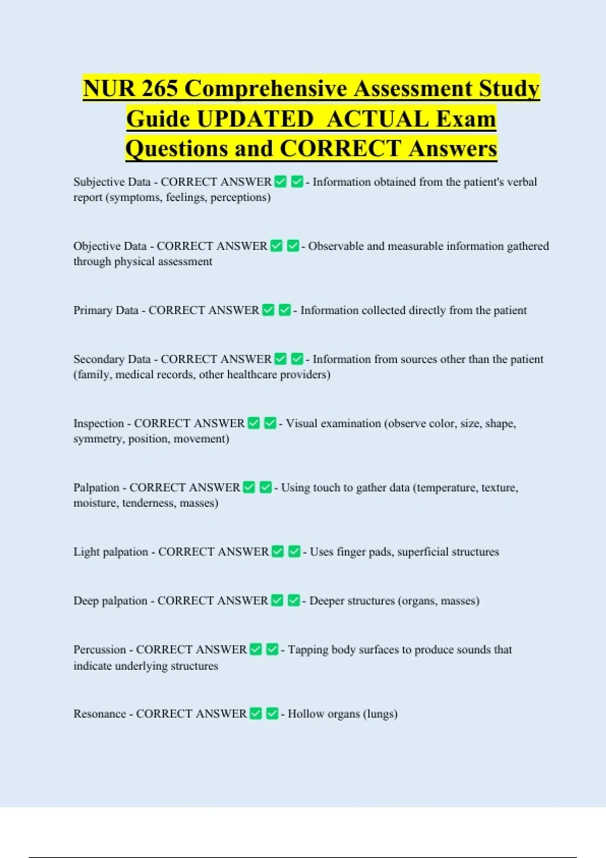 NUR 265 Final Study Guide: Comprehensive Assessment Techniques UPDATED ACTUAL Exam Questions and CORRECT Answers