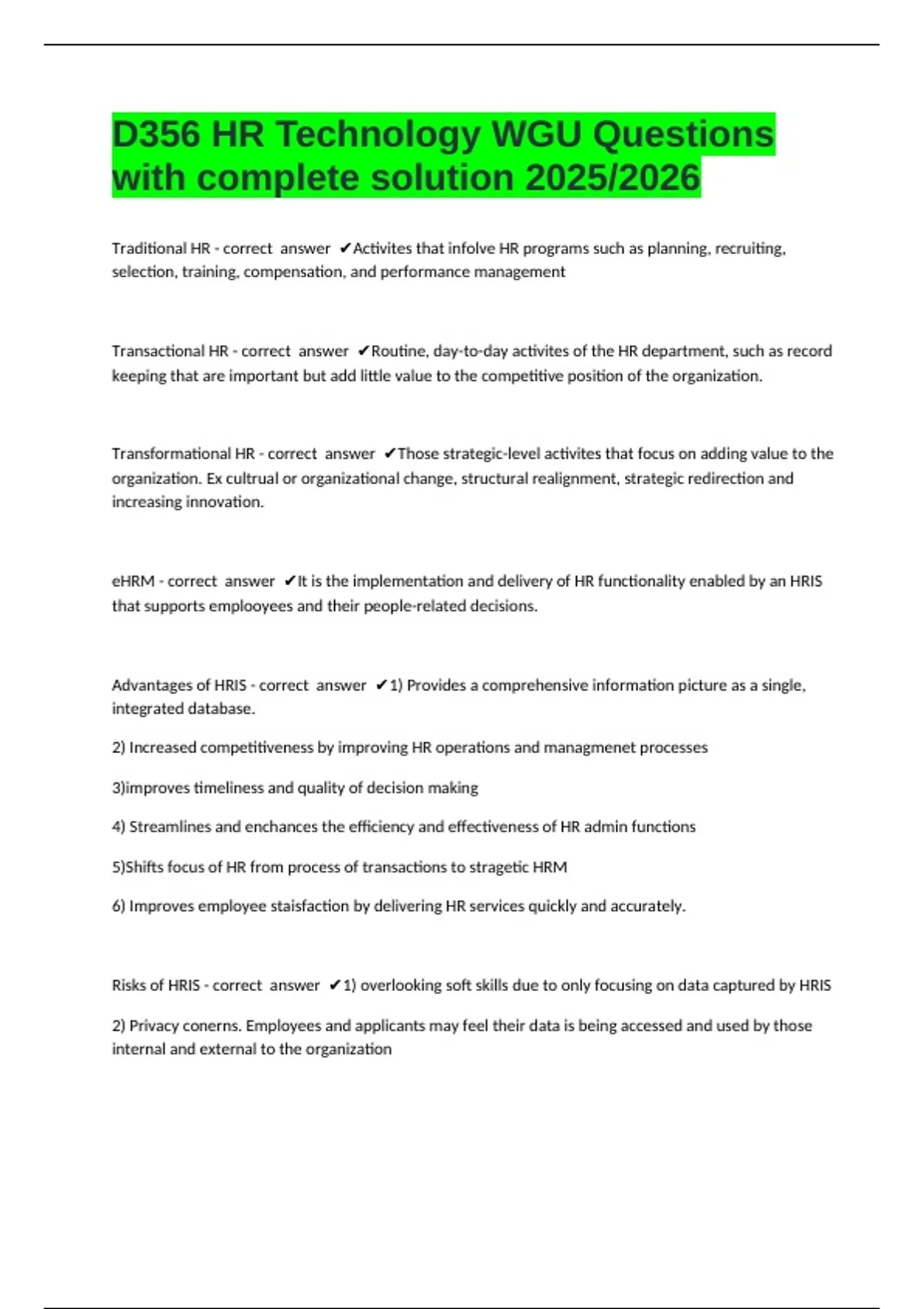 1 Exam (elaborations) WGU HR Tech D356 Question and answers rated A+ 2025/2026 2 Exam (elaborations) D356 - HR Technology (Pre-Assessment) Question and answers rated A+ 2025/2026 3 Exam (elaborations) D356 Cost & Benefits Chapter 6 Questions with complete solution 2025/2026 4 Exam (elaborations) D356 HR Technology - Pre Assessment Question and answ