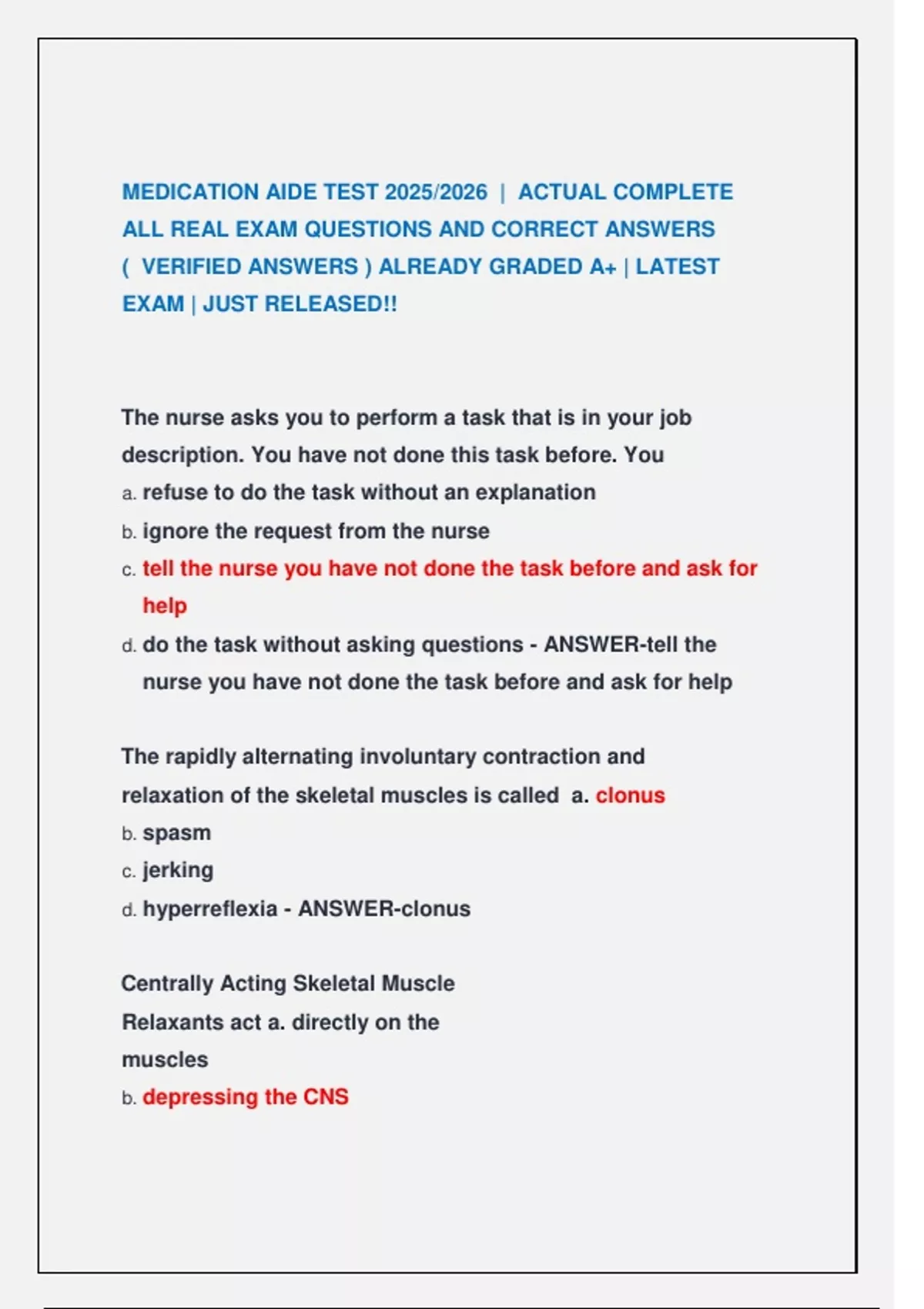 Medication Aide TEST 2025/2026 || EXAM ACTUAL COMPLETE REAL EXAM QUESTIONS AND CORRECT ANSWER MEDICATION AIDE TEST 2025/2026 | ACTUAL COMPLETE ALL REAL EXAM QUESTIONS AND CORRECT ANSWERS ( VERIFIED ANSWERS ) Medication Aide TEST 2025/2026 ACTUAL COMPLETE REAL EXAM QUESTIONS AND CORRECT ANSWERS (VERIFIED ANSWERS) ALREADY GRADED A+ | NEWEST EXAM