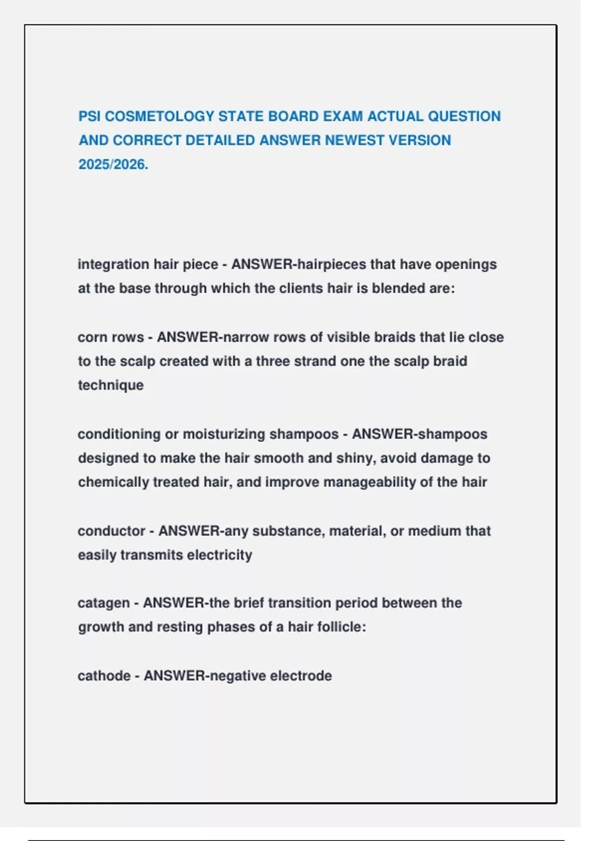 PSI COSMETOLOGY STATE BOARD EXAM ACTUAL QUESTION AND CORRECT DETAILED ANSWER NEWEST VERSION 2025/2026. PSI cosmetology state board Exam , Most Recent Exam 2025/2026 Actual Complete Real Exam Questions And Correct Answers (Verified Answers) Already Graded A+ / Newest Exam /Just Released!!