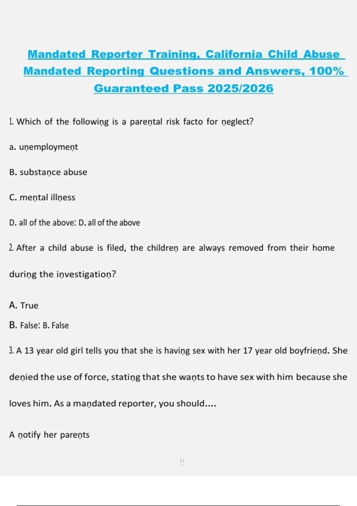 Child Abuse (LAUSD) Assessment Exam – Actual Questions and Answers Rated 100% Correct 2025/2026 Child Abuse Mandated Reporter: General Training Final Assessment Exam Questions and Complete Solutions – Latest 2025/2026 Mandated Reporter: California Child Abuse & Neglect – Actual Assessment Exam Questions and Verified Answers 2025/2026 Mandated Repor