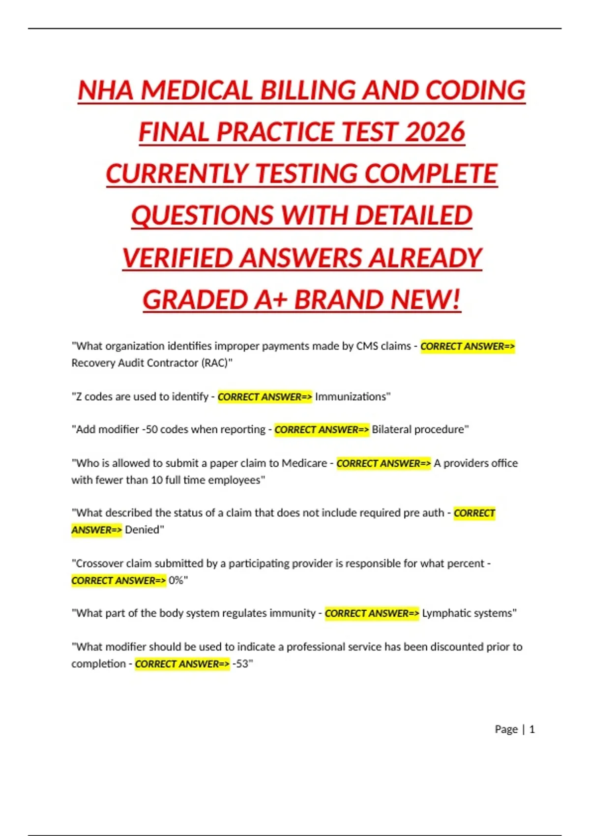 NHA BILLING AND CODING PRACTICE TEST ACTUAL EXAM QUESTIONS WITH DETAILED VERIFIED ANSWERS PACKAGE DEAL