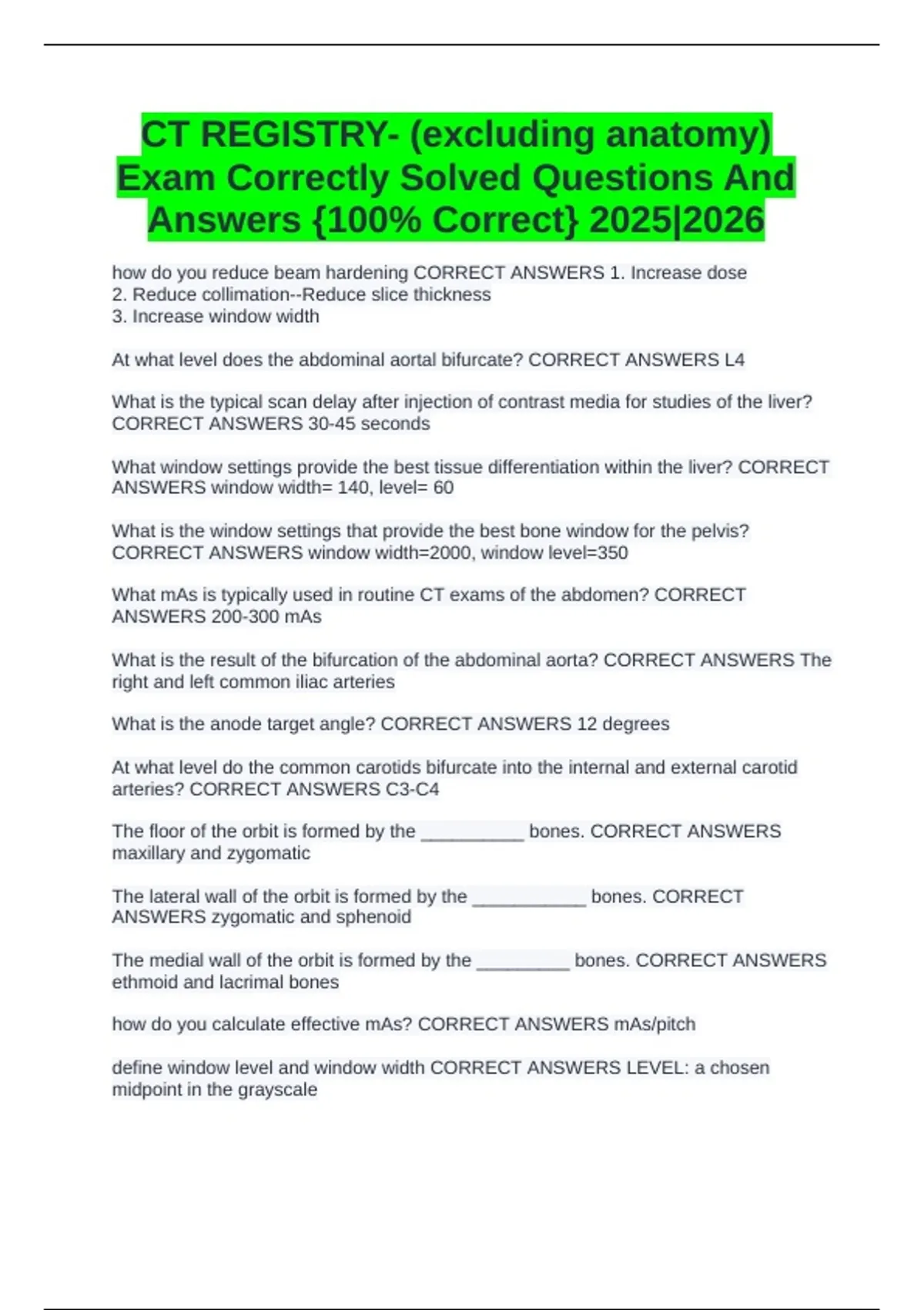 CT registry Exam Solved Correctly To Score A+ CT Registry Review Post-Test 5 Questions With 100% Correct Answers!! CT registry review Exam 4 Questions And Answers For A+ Score!!! 2025|2026