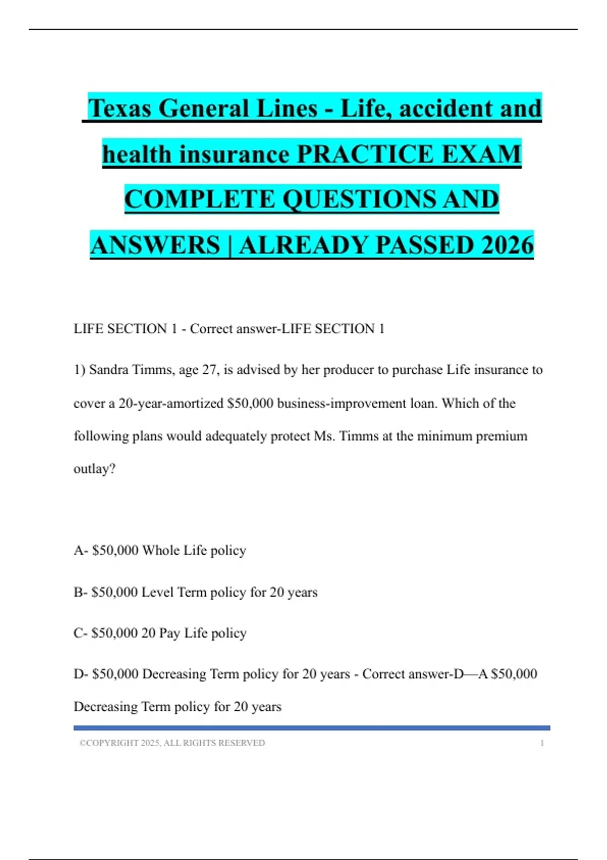 Texas General Lines - Life, accident and health insurance PRACTICE EXAM COMPLETE QUESTIONS AND ANSWERS | ALREADY PASSED 2026