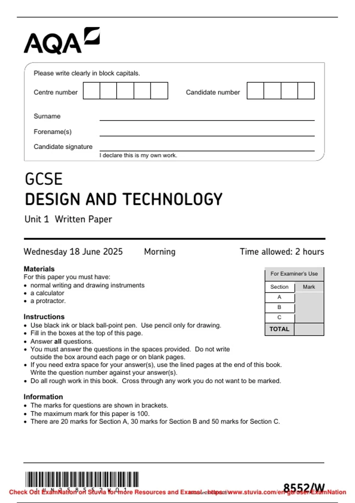 GCSE Design and Technology AQA Paper 1 + Markscheme 2025