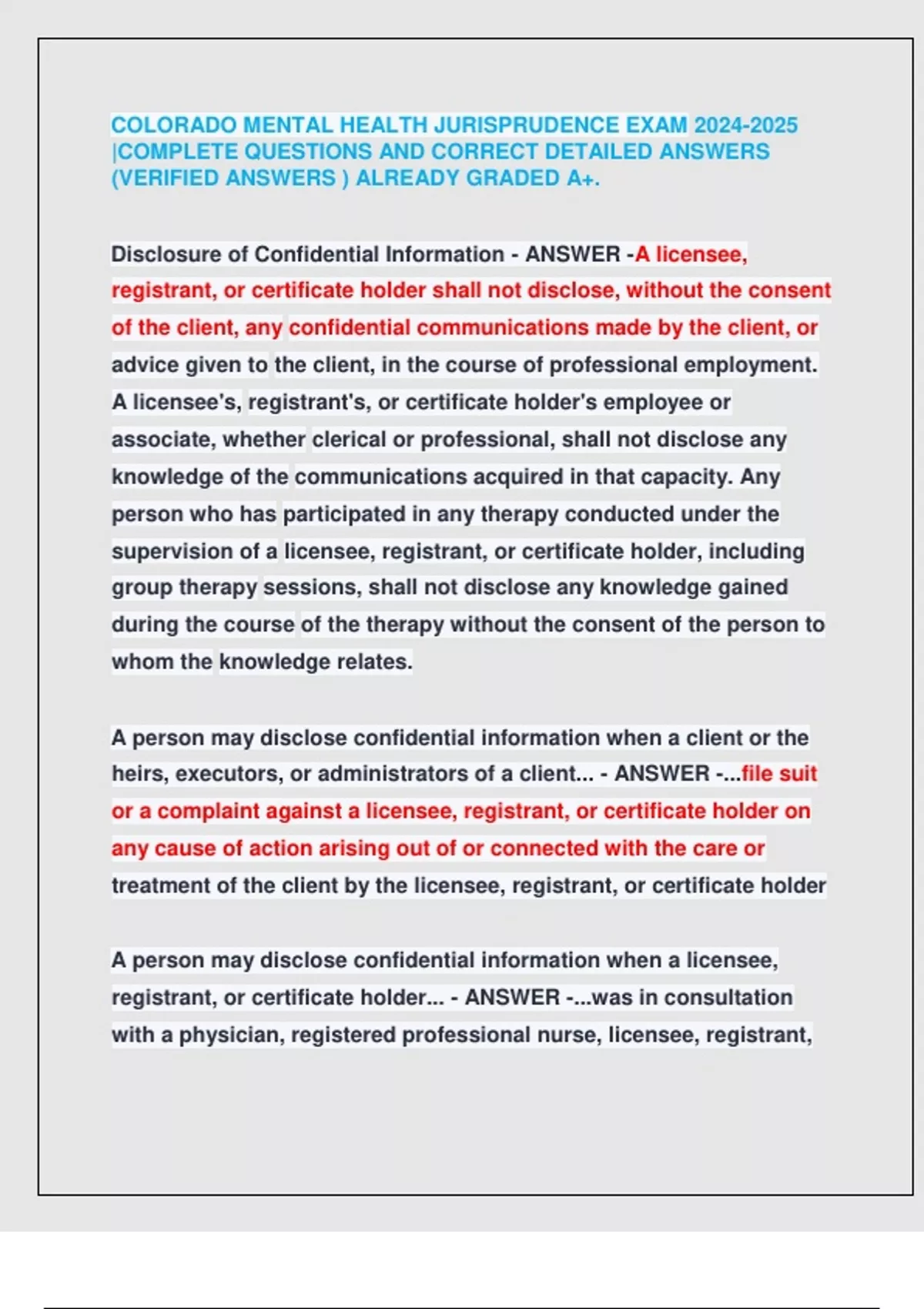 COLORADO MENTAL HEALTH JURISPRUDENCE 2025/2026 COLORADO MENTAL HEALTH JURISPRUDENCE EXAM ,MOST RECENT EXAM 2025/2026 BANK COLORADO MENTAL HEALTH JURISPRUDENCE EXAM 2024/2025 ACTUAL COMPLETE REAL EXAM QUESTIONS AND CORRECT DETAILED ANSWERS WITH RATIONALES COLORADO MENTAL HEALTH JURISPRUDENCE EXAM |COMPLETE QUESTIONS