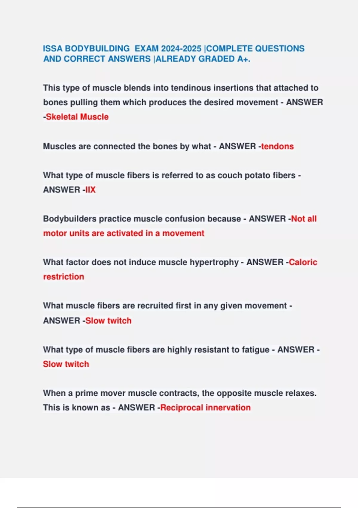 ISSA Bodybuilding Exam, Most Recent Exam 2025/2026 Actual Complete Real Exam Questions And Correct Answers ISSA Bodybuilding Exam 2025/2026 Actual Complete Real Exam Questions with 100% Correct Answers | Verified Answers | 2025 Latest Update!! ISSA BODYBUILDING EXAM |COMPLETE QUESTIONS AND CORRECT ANSWERS |ALREADY GRADED A+.