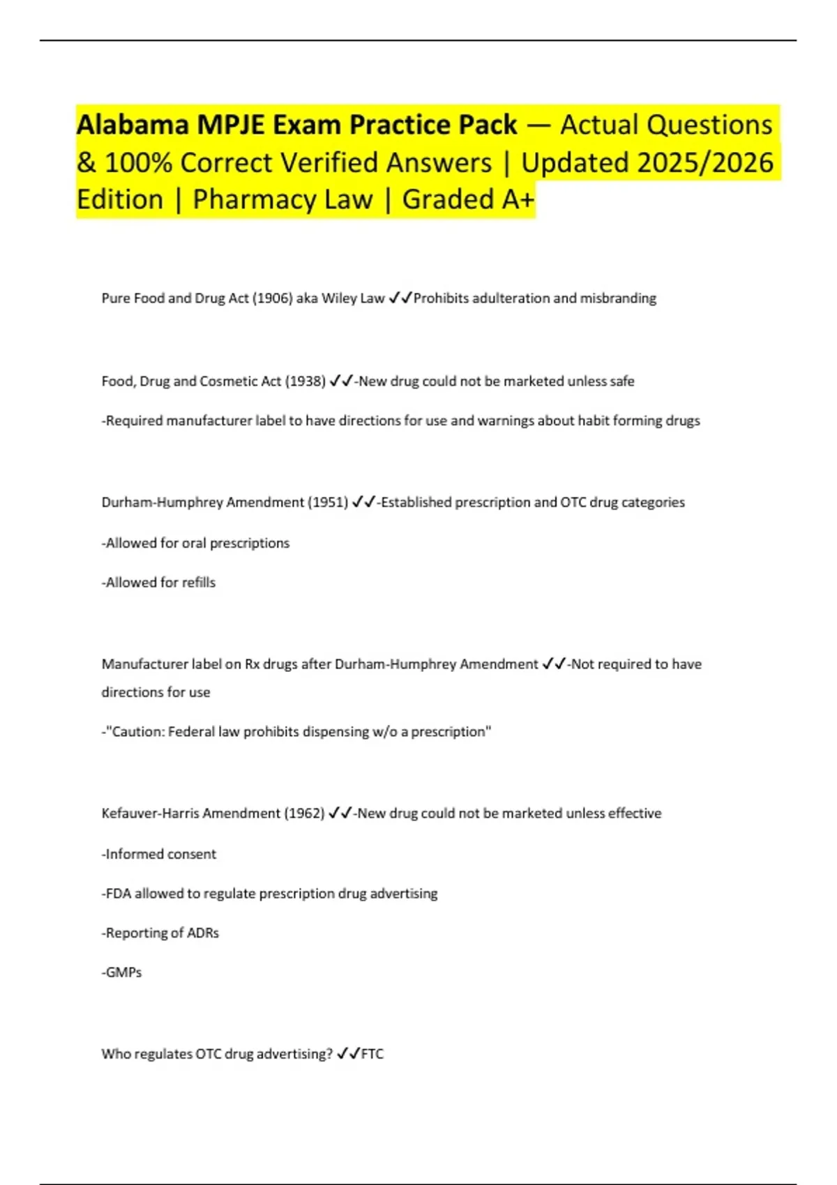 Powerful MPJE pharmacy law bundle covering Alabama, Kansas, and Ohio. Includes verified actual exam questions, accurate answers, and updated 2025 review content. Perfect for fast, guaranteed law exam preparation.