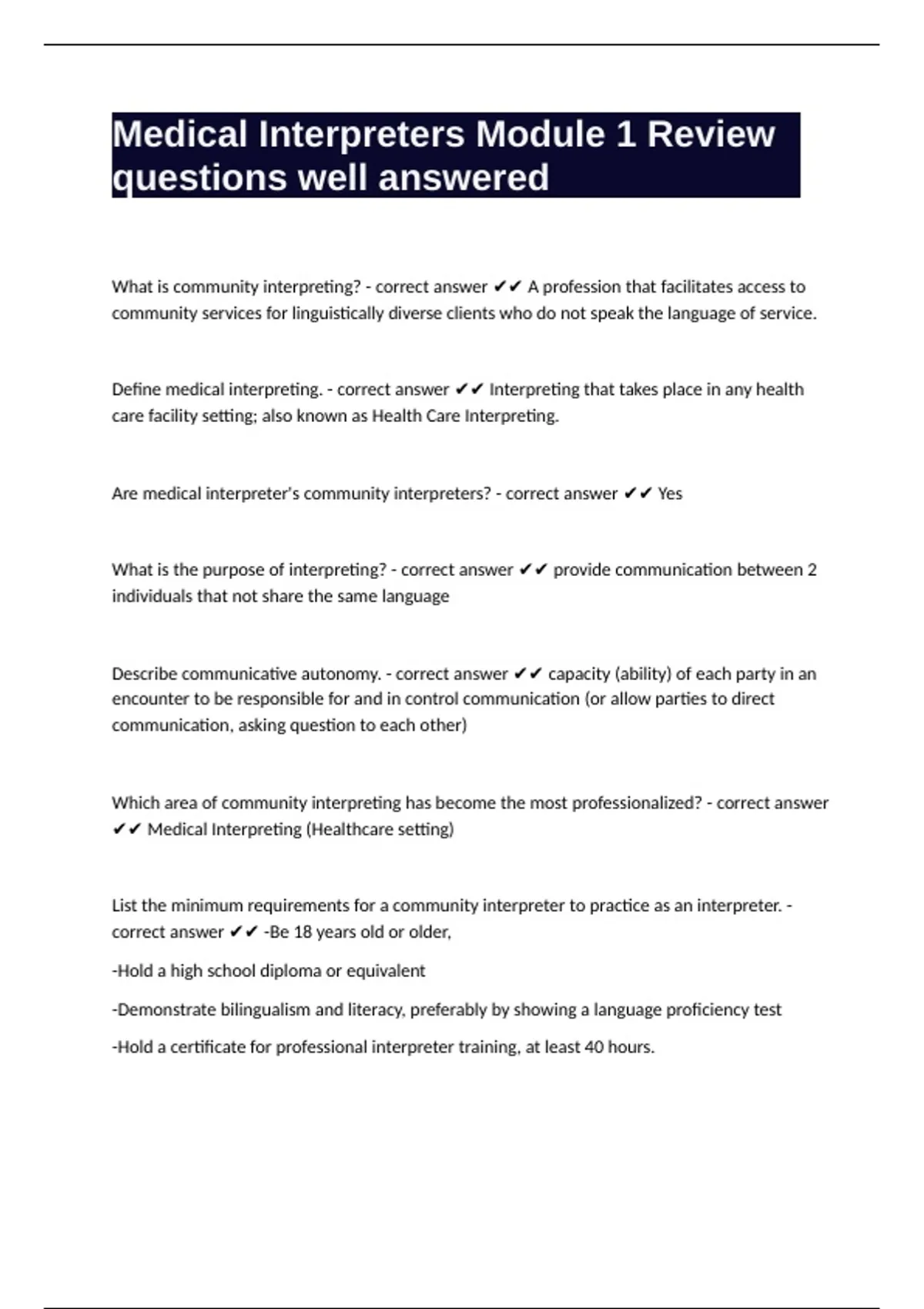 1 Exam (elaborations) Medical Interpreting Written Exam questions & answers 2 Exam (elaborations) Medical Interpreting Exam questions with verified answers 3 Exam (elaborations) Medical Interpreter Certification Written Exam correctly answered to pass 4 Exam (elaborations) Medical interpreter Final exam questions with verified answers 5 Exam (e