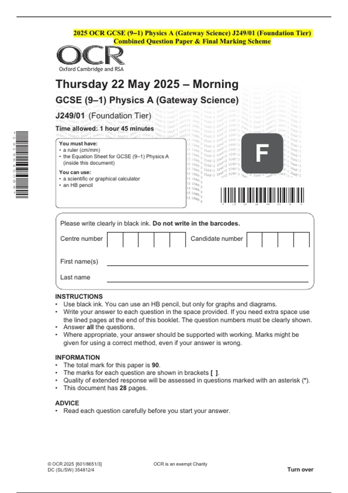 2025 OCR GCSE (9–1) Physics A (Gateway Science) J249/01 (Foundation Tier) Combined Question Paper & Final Marking Scheme 2 Exam (elaborations) 2025 OCR GCSE (9–1) Physics A (Gateway Science) J249/02 (Foundation Tier) Combined Question Paper & Final Marking Scheme 3 Exam (elaborations) 2025 OCR GCSE (9–1) Physics A (Gateway Science) J249/03 (Highe