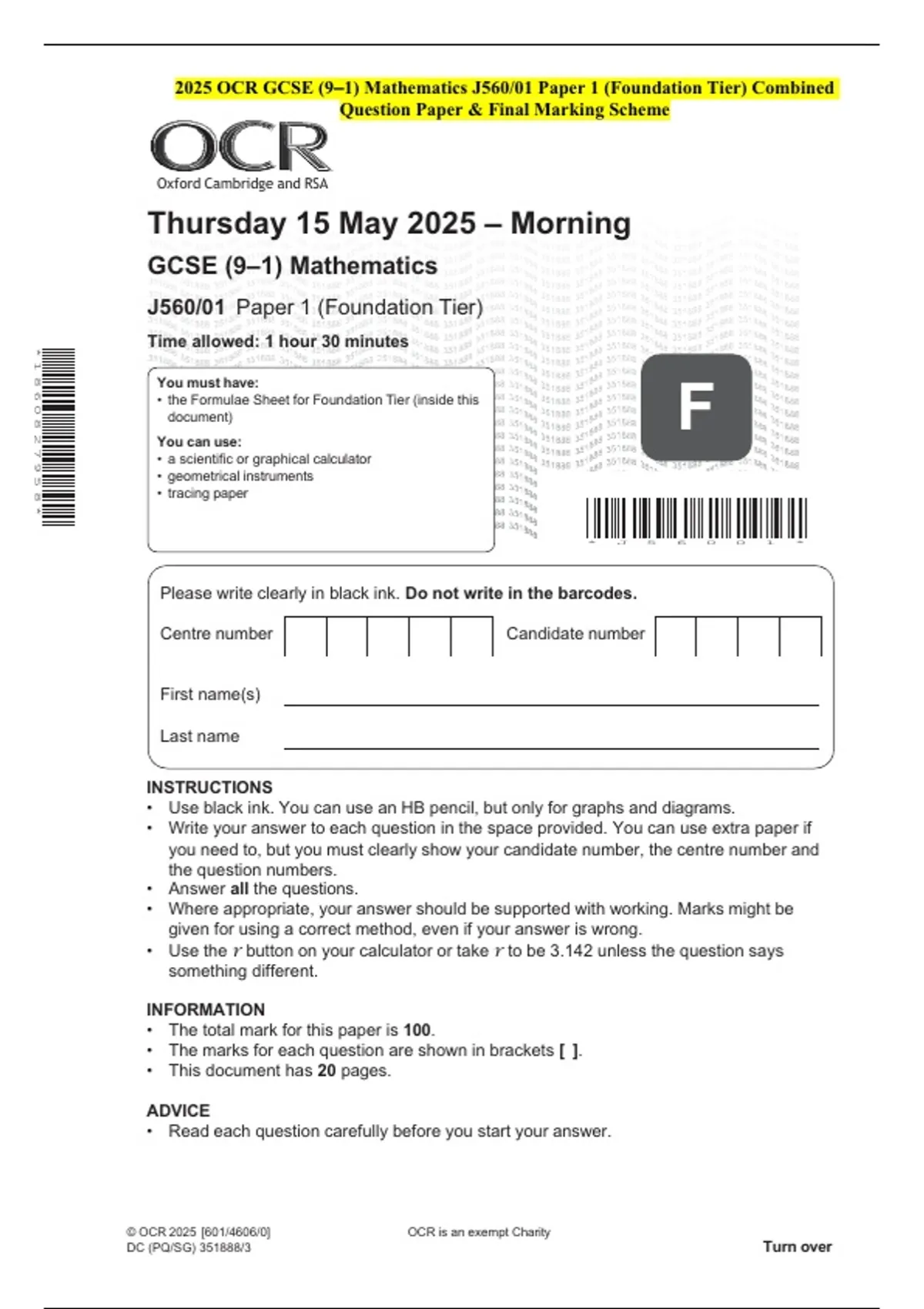 2025 OCR GCSE (9–1) Mathematics J560/02 Paper 2 (Foundation Tier) Combined Question Paper & Final Marking Scheme 3 Exam (elaborations) 2025 OCR GCSE (9–1) Mathematics J560/03 Paper 3 (Foundation Tier) Combined Question Paper & Final Marking Scheme 4 Exam (elaborations) 2025 OCR GCSE (9–1) Mathematics J560/04 Paper 4 (Higher Tier) Combined Questio