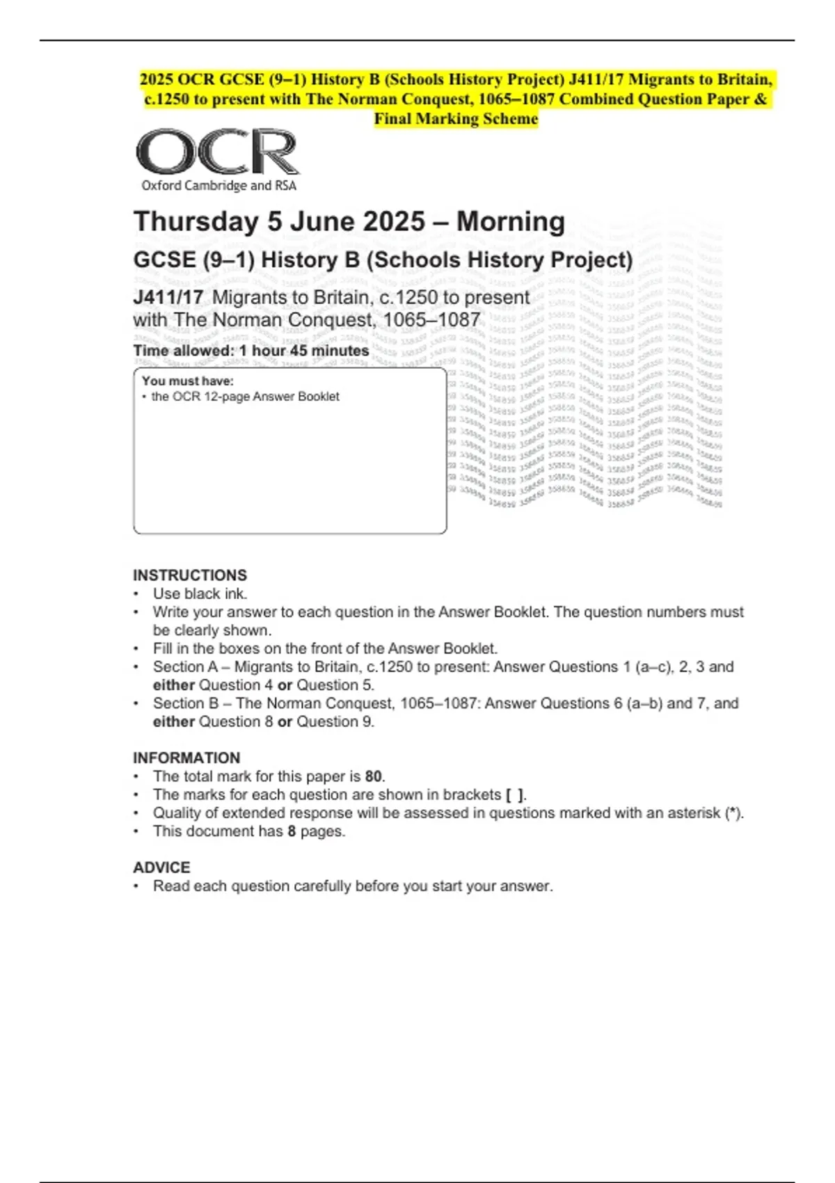 2025 OCR GCSE (9–1) History B (Schools History Project) J411/17 Migrants to Britain, c.1250 to present with The Norman Conquest, 1065–1087 Combined Question Paper & Final Marking Scheme 2 Exam (elaborations) 2025 OCR GCSE (9–1) History B (Schools History Project) J411/18 Migrants to Britain, c.1250 to present with The Elizabethans, 1580–1603 Combi