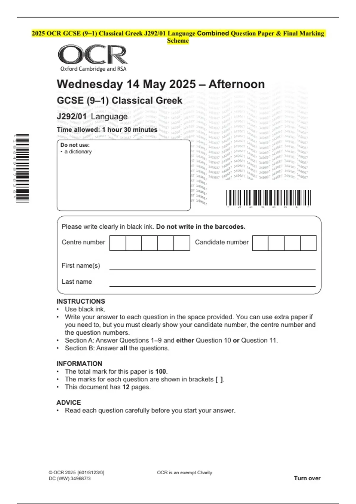 2025 OCR GCSE (9–1) Classical Greek J292/01 Language Combined Question Paper & Final Marking Scheme 2 Exam (elaborations) 2025 OCR GCSE (9–1) Classical Greek J292/02 Prose Literature A Combined Question Paper & Final Marking Scheme 3 Exam (elaborations) 2025 OCR GCSE (9–1) Classical Greek J292/06 Literature and Culture Combined Question Paper & F