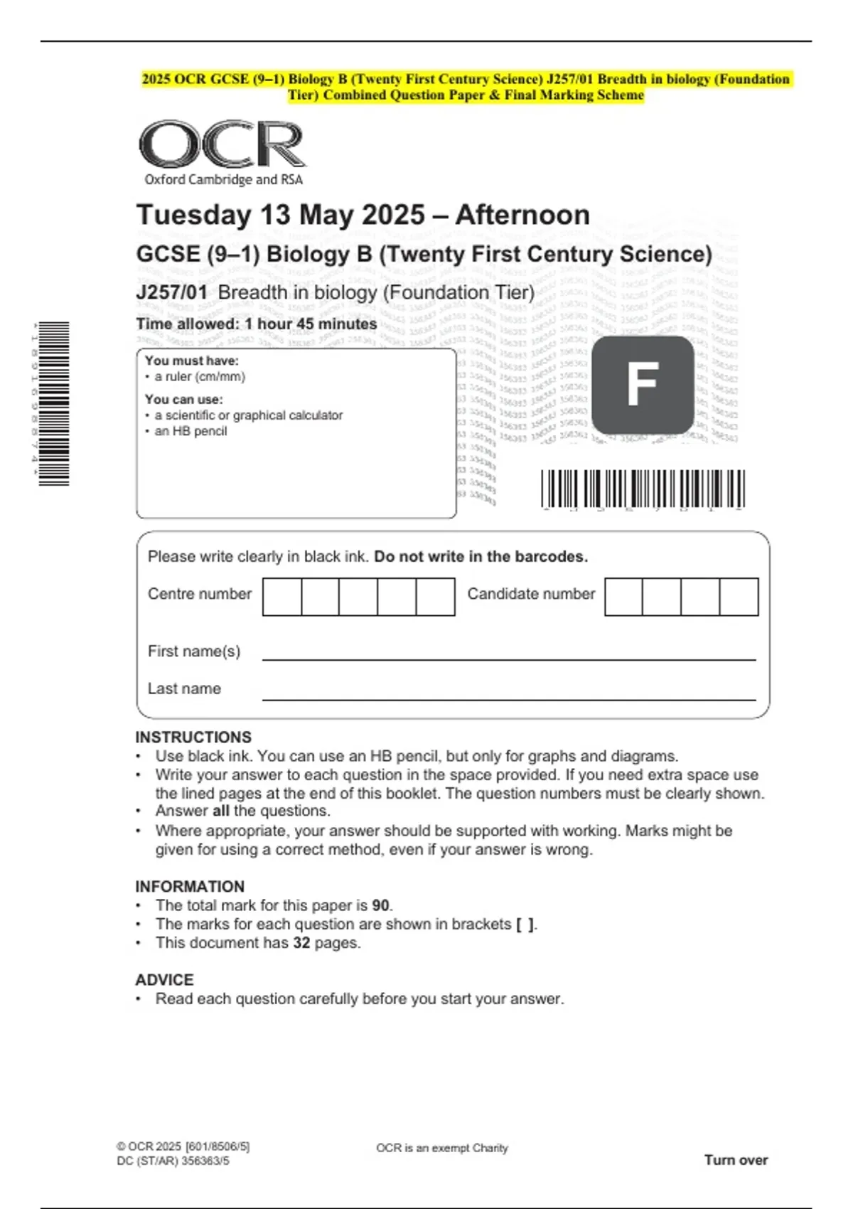 2025 OCR GCSE (9–1) Biology B (Twenty First Century Science) J257/01 Breadth in biology (Foundation Tier) Combined Question Paper & Final Marking Scheme 2 Exam (elaborations) 2025 OCR GCSE (9–1) Biology B (Twenty First Century Science) J257/02 Depth in Biology (Foundation Tier) Combined Question Paper & Final Marking Scheme 3 Exam (elaborations)